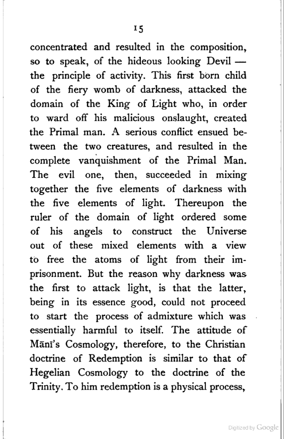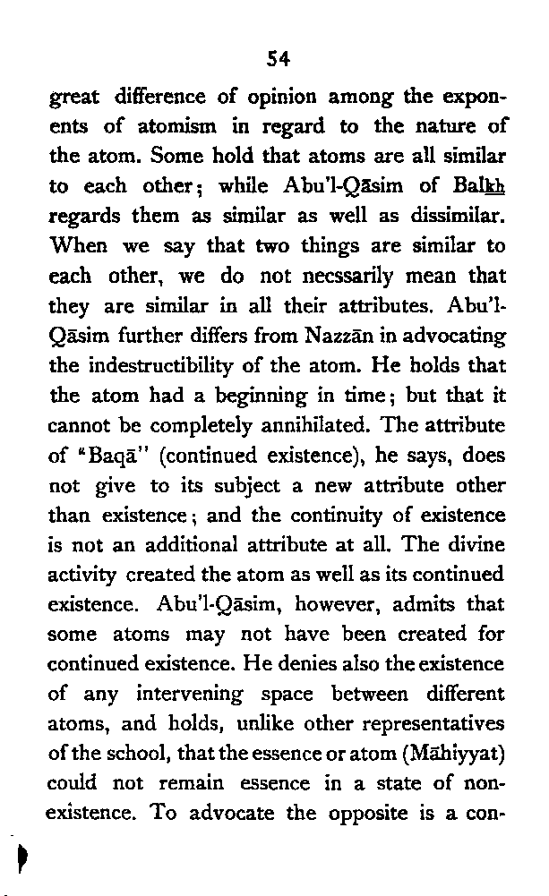 Let us now briefly sum up the results of our survey. We have seen that the Persian mind had to struggle against two different kinds of Dualism—pre-Islamic Magian Dualism, and post-Islamic Greek Dualism, though the fundamental problem of the diversity of things remains essentially the same. The attitude of the pre-Islamic Persian thinkers is thoroughly objective, and hence the results of their intellectual efforts are more or less materialistic. The Pre-Islamic thinkers, however, clearly perceived that the original Principle must be dynamically conceived. With Zoroaster both the primary spirits are "active", with Mānī the principle of Light is passive, and the principle of Darkness is aggressive. But their analysis of the various elements which constitute the Universe is ridiculously meagre; their conception of the [Pg 193] Universe is most defective on its statical side. There are, therefore, two weak points in their systems:—