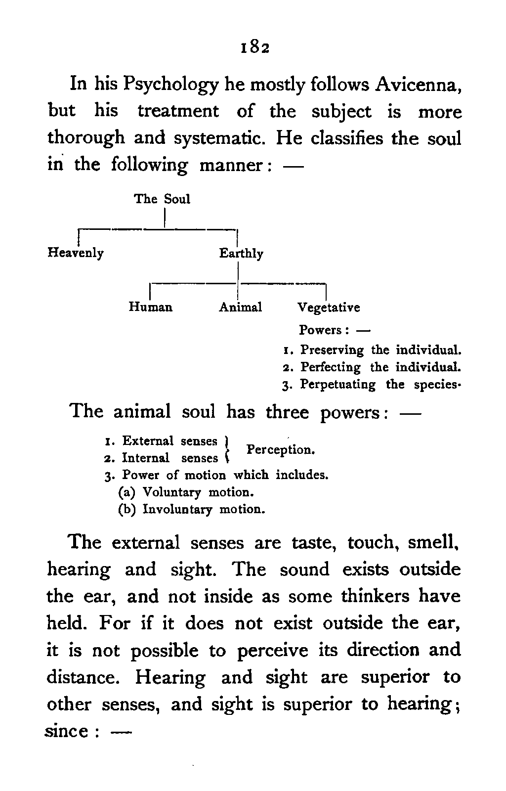 The external senses are taste, touch, smell, hearing and sight. The sound exists outside the ear, and not inside as some thinkers have held. For if it does not exist outside the ear, it is not possible to perceive its direction and distance. Hearing and sight are superior to other senses, and sight is superior to hearing; since: [Pg 183]—