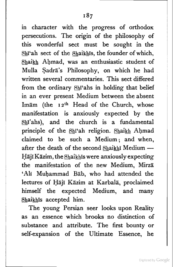 But all the various lines of Persian thought once more find a synthesis in that great religious movement of Modern Persia—Bābism or Bahāism, which began as a Shī‘ah sect, with Mirzā ‘Alī Muḥammad Bāb of Shīrāz (b. 1820), and became less and less Islamic [Pg 187] in character with the progress of orthodox persecutions. The origin of the philosophy of this wonderful sect must be sought in the Shī‘ah sect of the Shaikhīs, the founder of which, Shaikh Aḥmad, was an enthusiastic student of Mulla Ṣadrā's Philosophy, on which he had written several commentaries. This sect differed from the ordinary Shī‘ahs in holding that belief in an ever present Medium between the absent Imām (the 12th Head of the Church, whose manifestation is anxiously expected by the Shī‘ahs), and the church is a fundamental principle of the Shī‘ah religion. Shaikh Aḥmad claimed to be such a Medium; and when, after the death of the second Shaikhī Medium—Ḥājī Kāzim, the Shaikhīs were anxiously expecting the manifestation of the new Medium, Mirzā ‘Alī Muḥammad Bāb, who had attended the lectures of Ḥājī Kāzim at Karbalā, proclaimed himself the expected Medium, and many Shaikhīs accepted him.