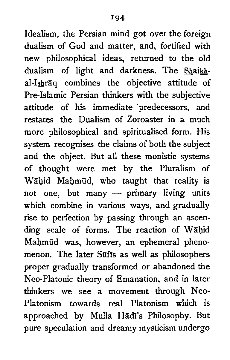 The first was remedied by Islām; the second by the introduction of Greek Philosophy. The advent of Islām and the study of Greek philosophy, however, checked the indigenous tendency towards monistic thought; but these two forces contributed to change the objective attitude characteristic of early thinkers, and aroused the slumbering subjectivity, which eventually reached its climax in the extreme Pantheism of some of the Ṣūfī schools. Al-Fārābī endeavoured to get rid of the dualism between God and matter, by reducing matter to a mere confused perception of the spirit; the Ash‘arite denied it altogether, and maintained a thoroughgoing Idealism. The followers of Aristotle continued to stick to their master's Prima Materia; the Ṣūfīs looked upon the material universe as a mere illusion, or a necessary "other," for the self-knowledge of God. It can, however, be safely stated that with the Ash‘arite [Pg 194] Idealism, the Persian mind got over the foreign dualism of God and matter, and, fortified with new philosophical ideas, returned to the old dualism of light and darkness. The Shaikh-al-Ishrāq combines the objective attitude of Pre-Islamic Persian thinkers with the subjective attitude of his immediate predecessors, and restates the Dualism of Zoroaster in a much more philosophical and spiritualised form. His system recognises the claims of both the subject and the object. But all these monistic systems of thought were met by the Pluralism of Wāḥid Maḥmūd, who taught that reality is not one, but many—primary living units which combine in various ways, and gradually rise to perfection by passing through an ascending scale of forms. The reaction of Wāḥid Maḥmūd was, however, an ephemeral phenomenon. The later Sūfīs as well as philosophers proper gradually transformed or abandoned the Neo-Platonic theory of Emanation, and in later thinkers we see a movement through Neo-Platonism towards real Platonism which is approached by Mulla Hādī's Philosophy. But pure speculation and dreamy mysticism undergo [Pg 195] a powerful check in Bābism which, unmindful of persecution, synthesises all the inherited philosophical and religious tendencies, and rouses the spirit to a consciousness of the stern reality of things. Though extremely cosmopolitan and hence quite unpatriotic in character, it has yet had a great influence over the Persian mind. The unmystic character and the practical tone of Bābism may have been a remote cause of the progress of recent political reform in Persia.