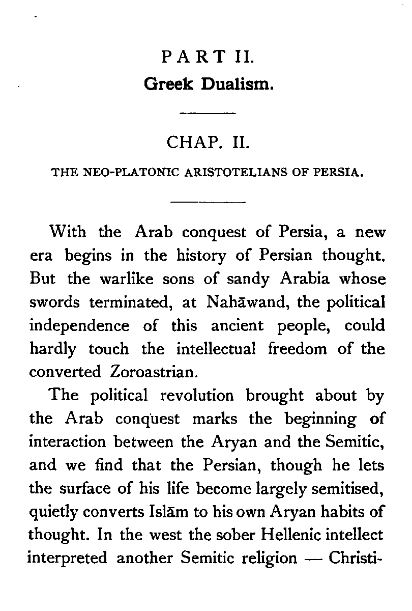 But the history of Persian thought presents a phenomenon peculiar to itself. In Persia, due perhaps to semitic influences, philosophical speculation has indissolubly associated itself with religion, and thinkers in new lines of thought have almost always been founders of new religious movements. After the Arab conquest, however, we see pure Philosophy severed from religion by the Neo-Platonic Aristotelians of Islam, but the severance was only a transient phenomenon. Greek philosophy, [Pg x] though an exotic plant in the soil of Persia, eventually became an integral part of Persian thought; and later thinkers, critics as well as advocates of Greek wisdom, talked in the philosophical language of Aristotle and Plato, and were mostly influenced by religious presuppositions. It is necessary to bear this fact in mind in order to gain a thorough understanding of post-Islamic Persian thought.