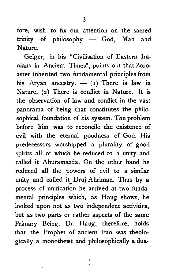 It is, however, beside our purpose to trace the origin and growth of Zoroaster's religious system. Our object, in so far as the present investigation is concerned, is to glance at the metaphysical side of his revelation. We, therefore, [Pg 3] wish to fix our attention on the sacred trinity of philosophy—God, Man and Nature.