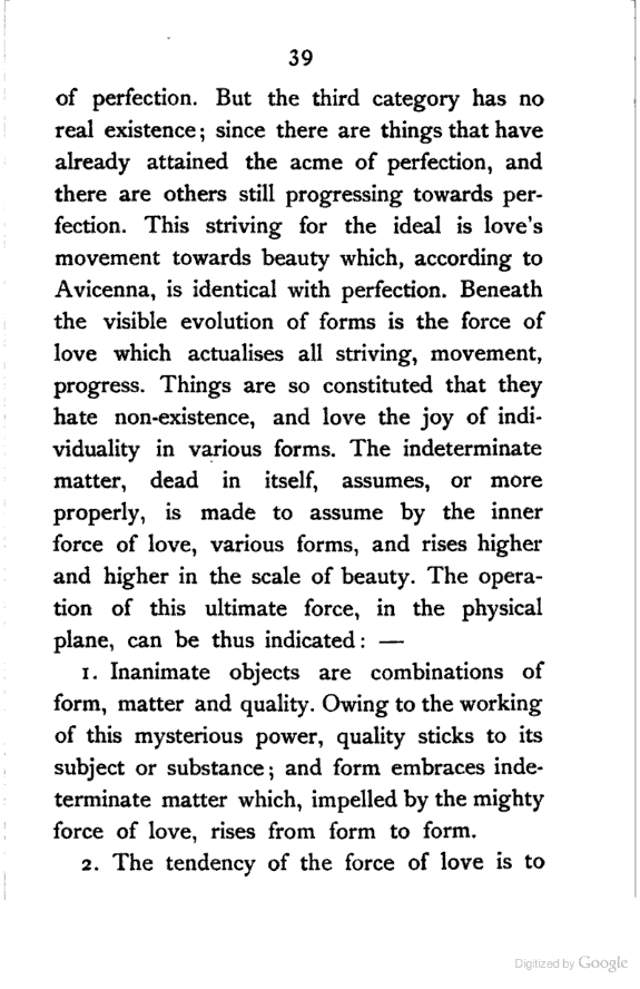 After the execution of ‘Alī Muḥammad Bāb, Bahāullāh, one of his principal disciples who were collectively called "The First Unity", took up the mission, and proclaimed himself the originator of the new dispensation, the absent Imām whose manifestation the Bāb had foretold. He freed the doctrine of his master [Pg 189] from its literalistic mysticism, and presented it in a more perfected and systematised form. The Absolute Reality, according to him, is not a person; it is an eternal living Essence, to which we apply the epithets Truth and Love only because these are the highest conceptions known to us. The Living Essence manifests itself through the Univere with the object of creating in itself atoms or centres of consciousness, which as Dr. McTaggart would say, constitute a further determination of the Hegelian Absolute. In each of these undifferentiated, simple centres of consciousness, there is hidden a ray of the Absolute Light itself, and the perfection of the spirit consists in gradually actualising, by contact with the individualising principle—matter, its emotional and intellectual possibilities, and thus discovering its own deep being—the ray of eternal Love which is concealed by its union with consciousness. The essence of man, therefore, is not reason or consciousness; it is this ray of Love—the source of all impulse to noble and unselfish action, which constitutes the real man. The influence of Mulla Ṣadrā's doctrine [Pg 190] of the incorporeality of Imagination is here apparent. Reason, which stands higher than Imagination in the scale of evolution, is not a necessary condition, according to Mulla Ṣadrā, of immortality. In all forms of life there is an immortal spiritual part, the ray of Eternal Love, which has no necessary connection with self-consciousness or reason, and survives after the death of the body. Salvation, then, which to Buddha consists in the starving out of the mind-atoms by extinguishing desire, to Bahāullāh lies in the discovery of the essence of love which is hidden in the atoms of consciousness themselves.[190:1] Both, however, agree that after death thoughts and characters of men remain, subject to other forces of a similar character, in the spiritual world, waiting for another opportunity to find a suitable physical accompaniment in order to continue the process of discovery (Bahāullāh) or destruction (Buddha). To Bahāullāh the conception of Love is higher than the conception of Will. Schopenhauer conceived reality as Will which was driven to [Pg 191] objectification by a sinful bent eternally existing in its nature. Love or Will, according to both, is present in every atom of life; but the cause of its being there is the joy of self-expansion in the one case, and the inexplicable evil inclination in the other. But Schopenhauer postulates certain temporal ideas in order to account for the objectification of the Primordial Will; Bahāullāh, as far as I can see, does not explain the principle according to which the self-manifestation of the Eternal Love is realised in the Universe.