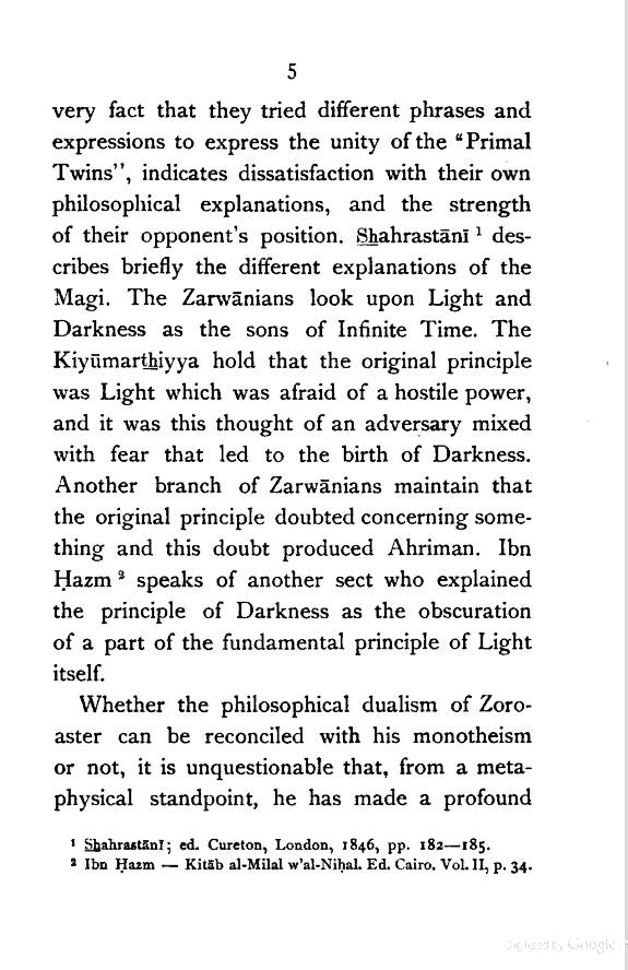 Geiger, in his "Civilisation of Eastern Iranians in Ancient Times", points out that Zoroaster inherited two fundamental principles from his Aryan ancestry.—(1) There is law in Nature. (2) There is conflict in Nature. It is the observation of law and conflict in the vast panorama of being that constitutes the philosophical foundation of his system. The problem before him was to reconcile the existence of evil with the eternal goodness of God. His predecessors worshipped a plurality of good spirits all of which he reduced to a unity and called it Ahuramazda. On the other hand he reduced all the powers of evil to a similar unity and called it Druj-Ahriman. Thus by a process of unification he arrived at two fundamental principles which, as Haug shows, he looked upon not as two independent activities, but as two parts or rather aspects of the same Primary Being. Dr. Haug, therefore, holds that the Prophet of ancient Iran was theologically a monotheist and philosophically a [Pg 4] dualist.[4:1] But to maintain that there are "twin"[4:2] spirits—creators of reality and nonreality—and at the same time to hold that these two spirits are united in the Supreme Being,[4:3] is virtually to say that the principle of evil constitutes a part of the very essence of God; and the conflict between good and evil is nothing more than the struggle of God against Himself. There is, therefore, an inherent weakness in his attempt to reconcile theological monotheism with philosophical dualism, and the result was a schism among the prophet's followers. The Zendiks[4:4] whom Dr. Haug calls heretics, but who were, I believe, decidedly more consistent than their opponents, maintained the independence of the two original spirits from each other, while the Magi upheld their unity. The upholders of unity endeavoured, in various ways, to meet the Zendiks; but the [Pg 5] very fact that they tried different phrases and expressions to express the unity of the "Primal Twins", indicates dissatisfaction with their own philosophical explanations, and the strength of their opponent's position. Shahrastānī[5:1] describes briefly the different explanations of the Magi. The Zarwānians look upon Light and Darkness as the sons of Infinite Time. The Kiyūmarthiyya hold that the original principle was Light which was afraid of a hostile power, and it was this thought of an adversary mixed with fear that led to the birth of Darkness. Another branch of Zarwānians maintain that the original principle doubted concerning something and this doubt produced Ahriman. Ibn Ḥazm[5:2] speaks of another sect who explained the principle of Darkness as the obscuration of a part of the fundamental principle of Light itself.