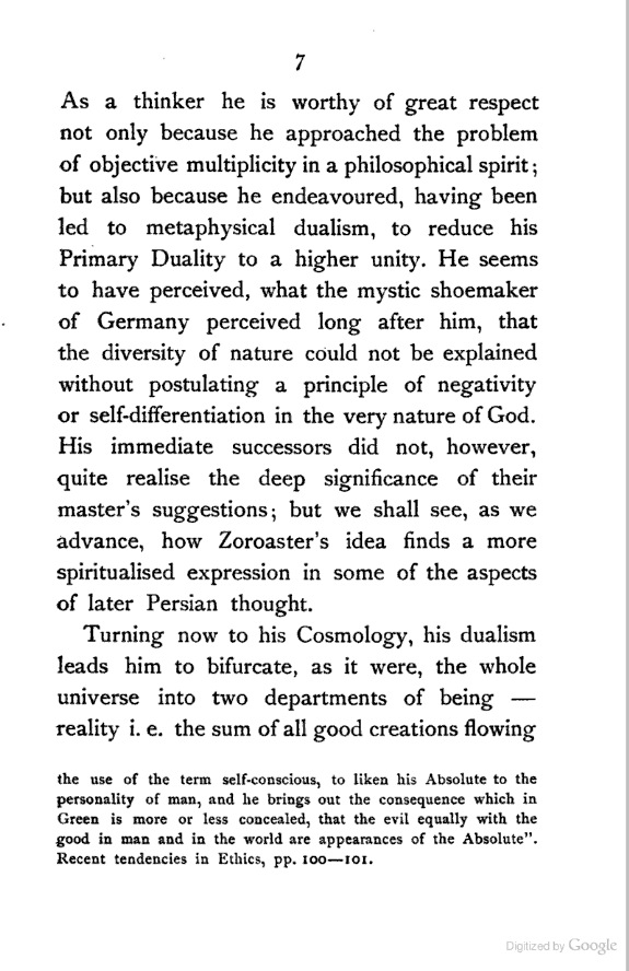 Whether the philosophical dualism of Zoroaster can be reconciled with his monotheism or not, it is unquestionable that, from a metaphysical standpoint, he has made a profound [Pg 6] suggestion in regard to the ultimate nature of reality. The idea seems to have influenced ancient Greek Philosophy[6:1] as well as early Christian Gnostic speculation, and through the latter, some aspects of modern western thought.[6:2] [Pg 7] As a thinker he is worthy of great respect not only because he approached the problem of objective multiplicity in a philosophical spirit; but also because he endeavoured, having been led to metaphysical dualism, to reduce his Primary Duality to a higher unity. He seems to have perceived, what the mystic shoemaker of Germany perceived long after him, that the diversity of nature could not be explained without postulating a principle of negativity or self-differentiation in the very nature of God. His immediate successors did not, however, quite realise the deep significance of their master's suggestions; but we shall see, as we advance, how Zoroaster's idea finds a more spiritualised expression in some of the aspects of later Persian thought.