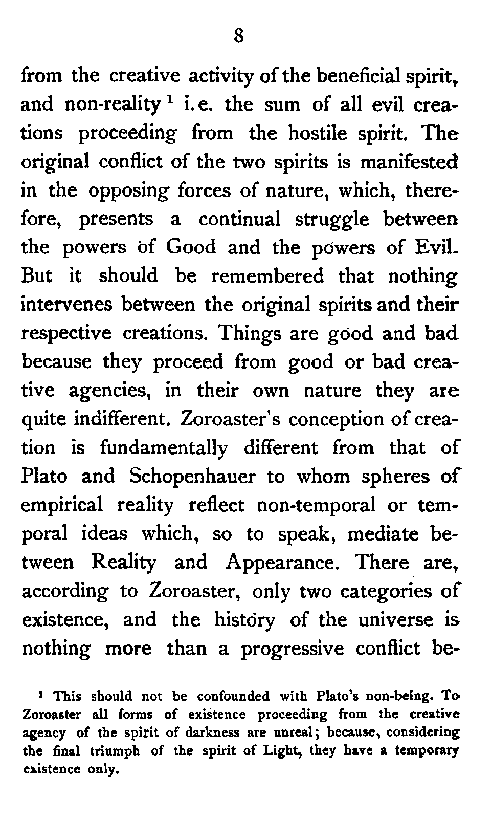 Turning now to his Cosmology, his dualism leads him to bifurcate, as it were, the whole universe into two departments of being—reality i.e. the sum of all good creations flowing [Pg 8] from the creative activity of the beneficial spirit, and non-reality[8:1] i.e. the sum of all evil creations proceeding from the hostile spirit. The original conflict of the two spirits is manifested in the opposing forces of nature, which, therefore, presents a continual struggle between the powers of Good and the powers of Evil. But it should be remembered that nothing intervenes between the original spirits and their respective creations. Things are good and bad because they proceed from good or bad creative agencies, in their own nature they are quite indifferent. Zoroaster's conception of creation is fundamentally different from that of Plato and Schopenhauer to whom spheres of empirical reality reflect non-temporal or temporal ideas which, so to speak, mediate between Reality and Appearance. There are, according to Zoroaster, only two categories of existence, and the history of the universe is nothing more than a progressive conflict between [Pg 9] the forces falling respectively under these categories. We are, like other things, partakers of this struggle, and it is our duty to range ourselves on the side of Light which will eventually prevail and completely vanquish the spirit of Darkness. The metaphysics of the Iranian Prophet, like that of Plato, passes on into Ethics, and it is in the peculiarity of the Ethical aspect of his thought that the influence of his social environments is most apparent.