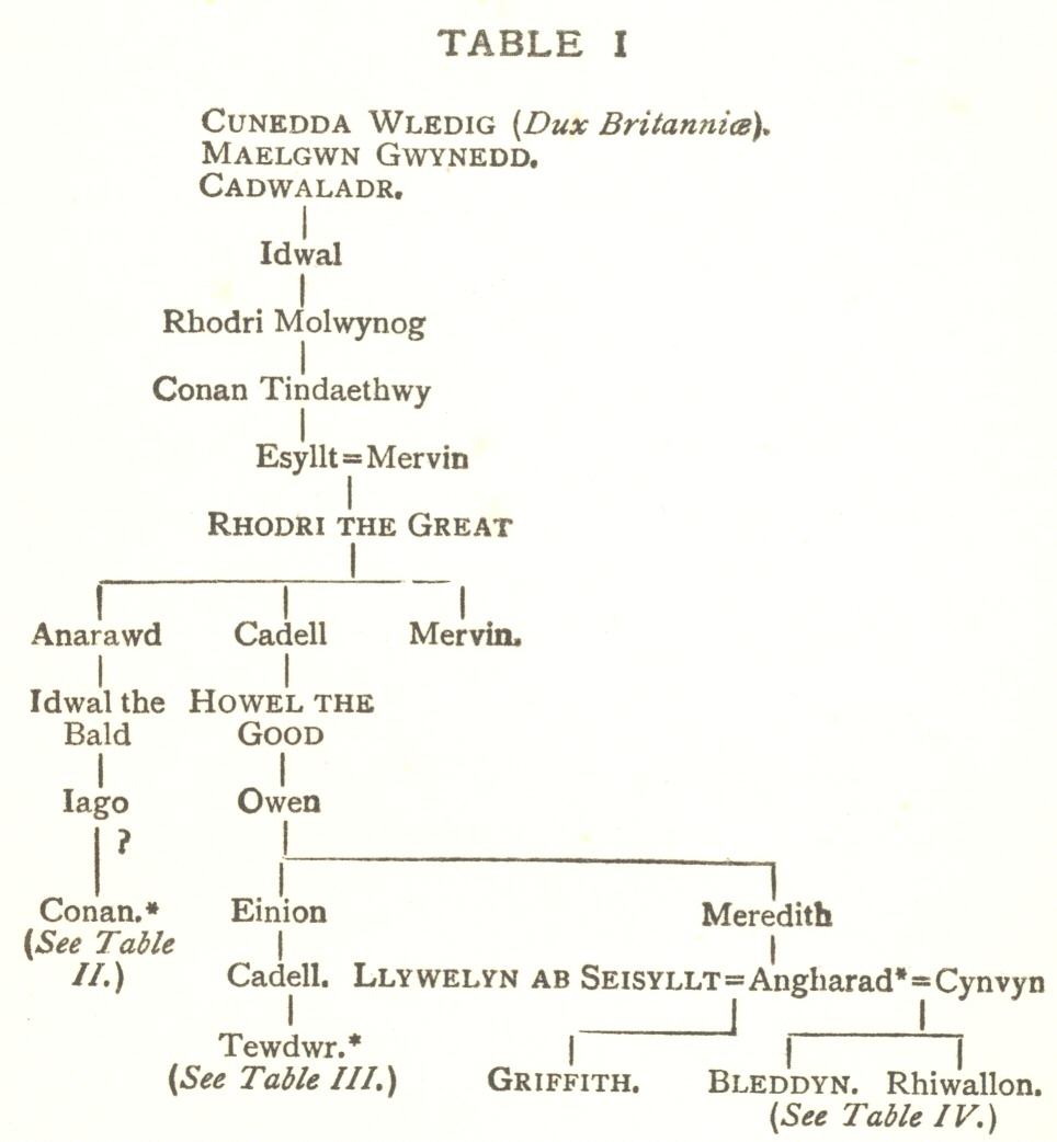 [135] This table contains the following genealogy. (For items with an asterisk: the links between the House of Cunedda and the three ruling families after the Norman Conquest rest on the authority of tradition rather than on that of records.)