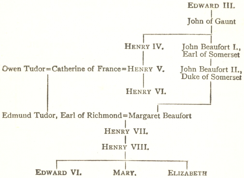 Catherine of France = Owen Tudor had issue Edmund Tudor, Earl of Richmond=Margaret Beaufort who had issue Henry VII. who had issue Henry VIII. who had issue Edward VI., Mary and Elizabeth.