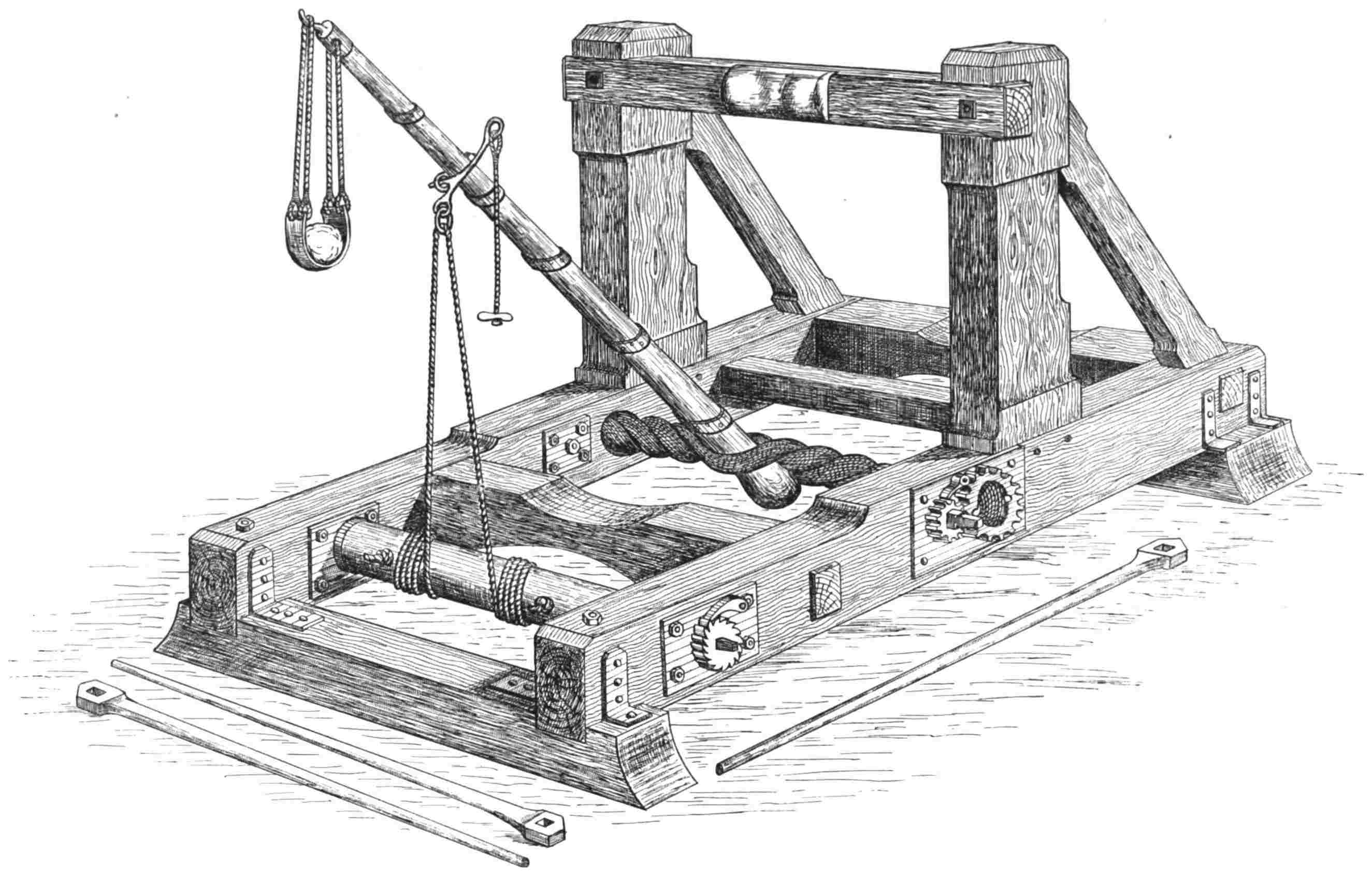 We know that the arm of a large engine was composed of several spars of wood and lengths of thick sinew fitted longitudinally, and then bound round with broad strips of raw hide which would afterwards set nearly as hard and tight as a sheath of metal.