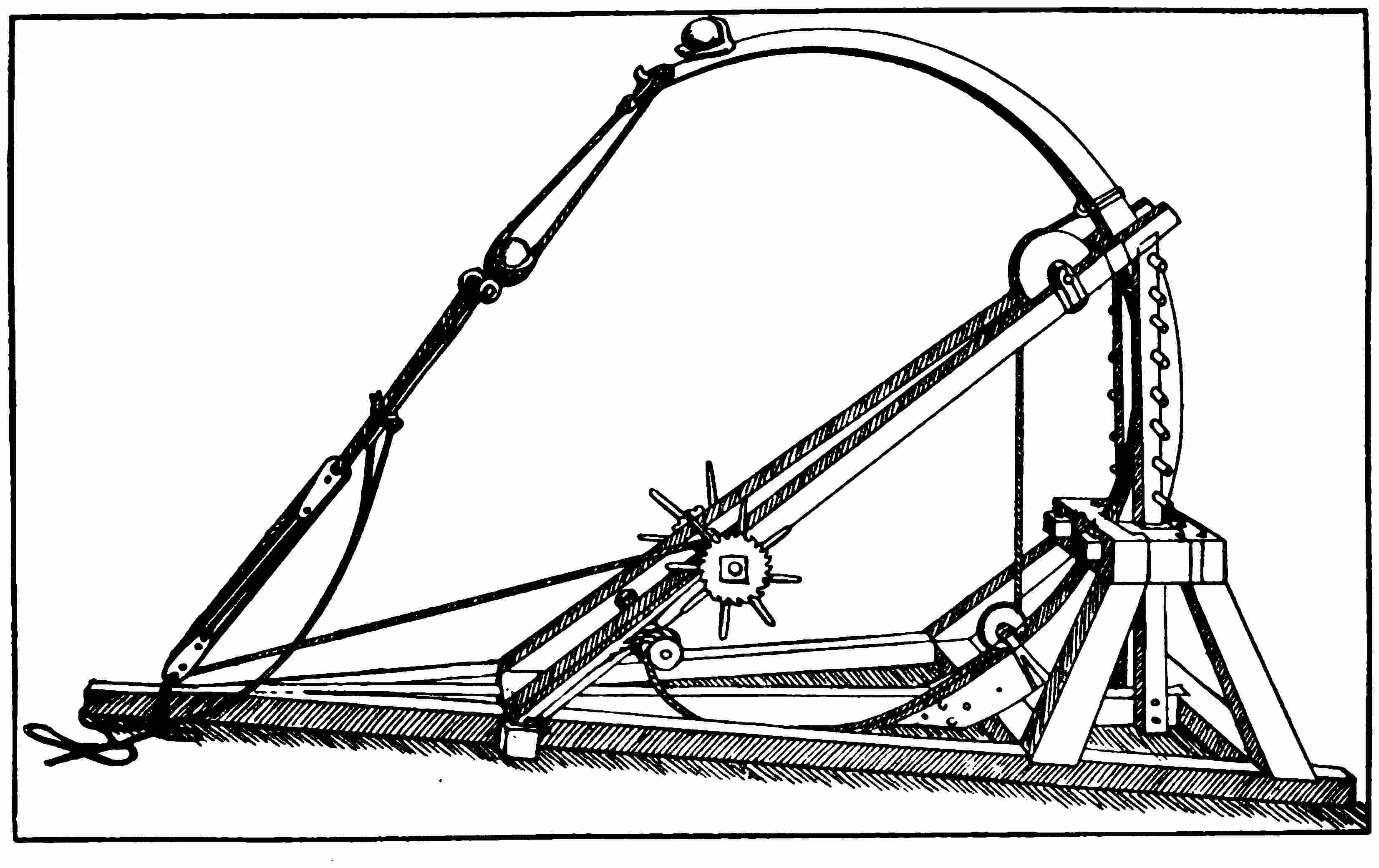 It frequently happens that in a mediæval picture of one of these machines some important mechanical detail is omitted, or, from the difficulty of portraying it correctly, is purposely concealed by figures of soldiers, an omission that may be supplied by reference to other representations of the same weapon.