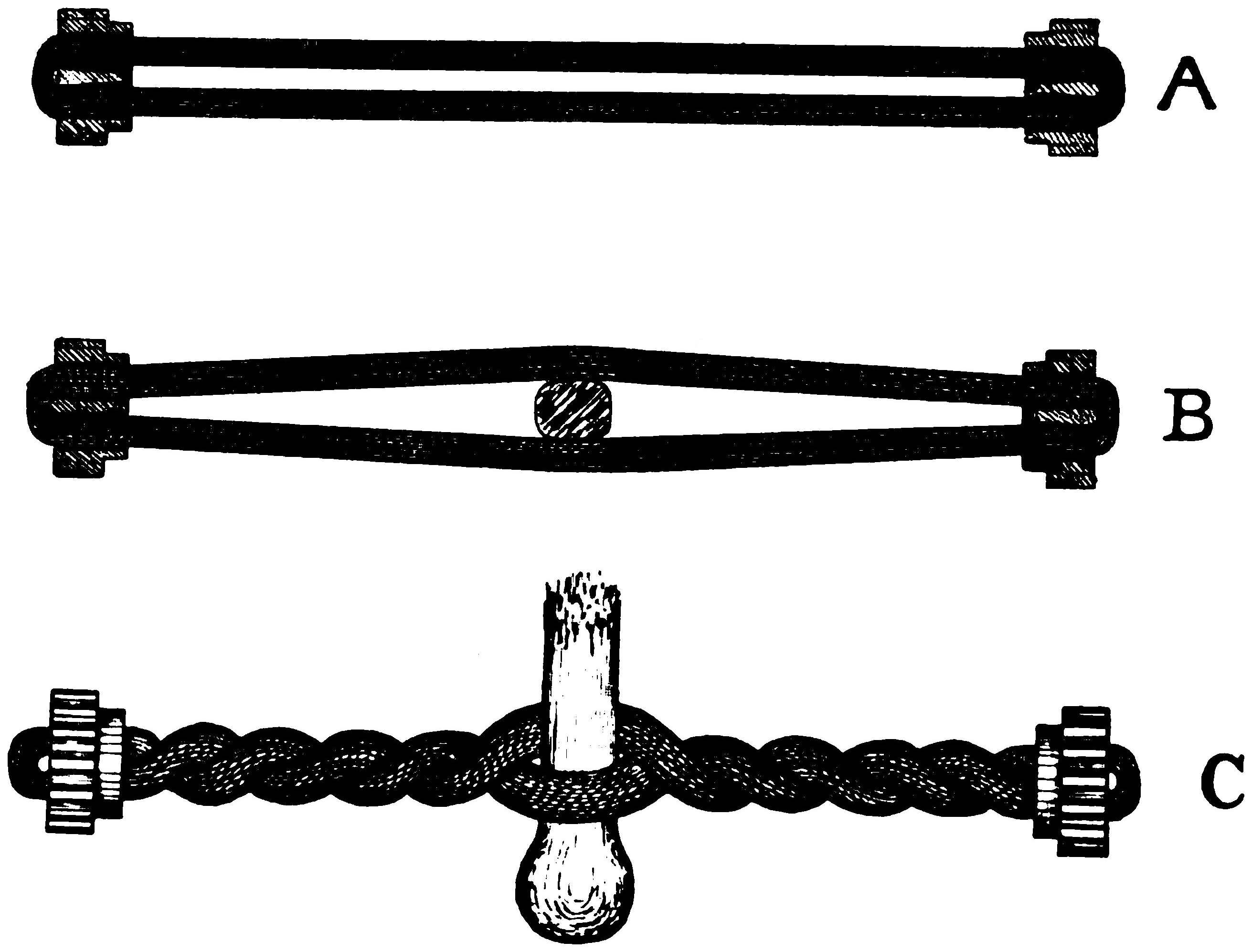 Every kind of sinew, or hair or rope, with which I have experimented, either breaks or loses its elasticity in a comparatively short time, if great pressure is applied. It has then to be renewed at no small outlay of expense and trouble. Rope skeins, with which we are obliged to fit our models, cannot possibly equal in strength and above all in elasticity, skeins of animal sinew or even of hair.