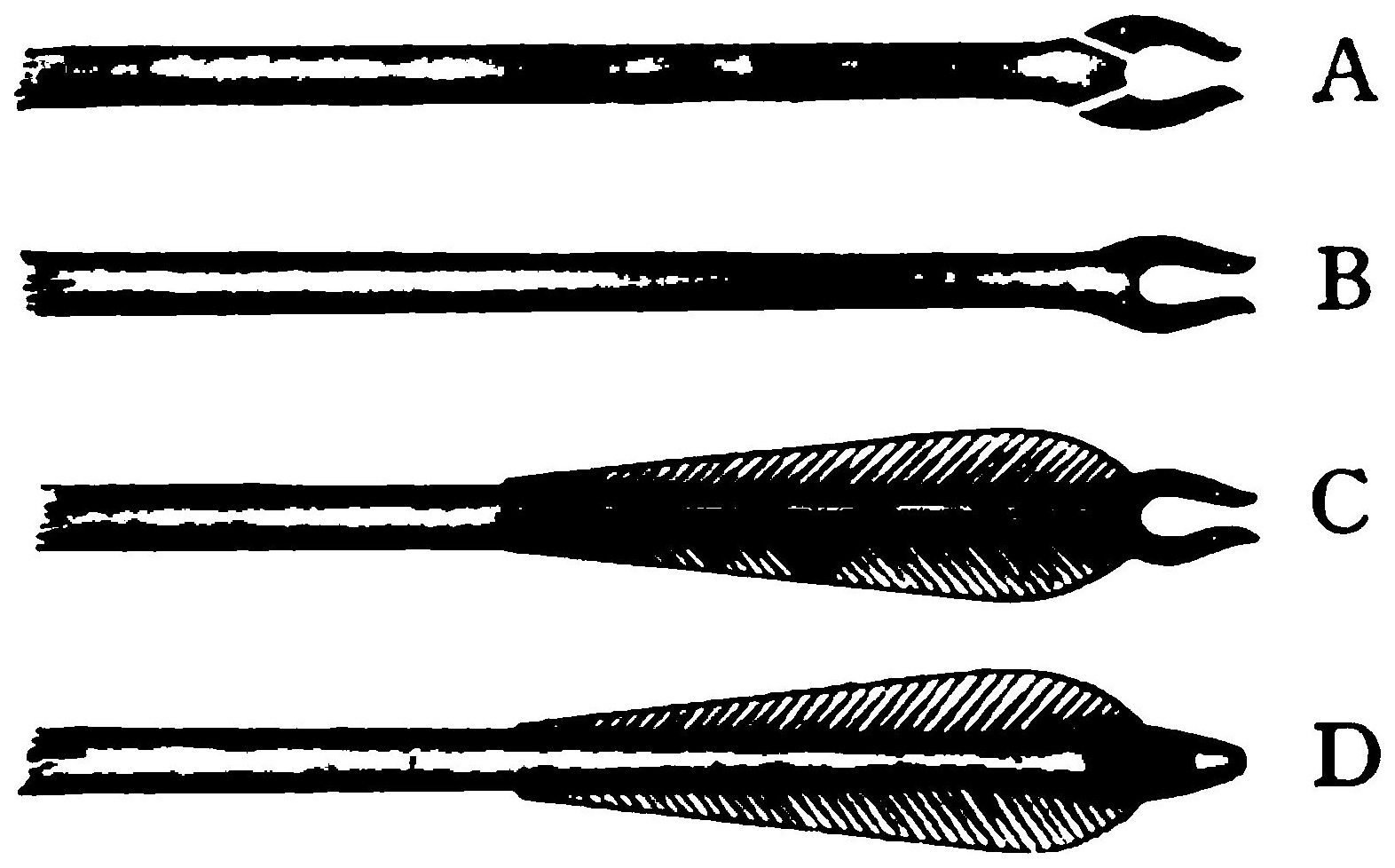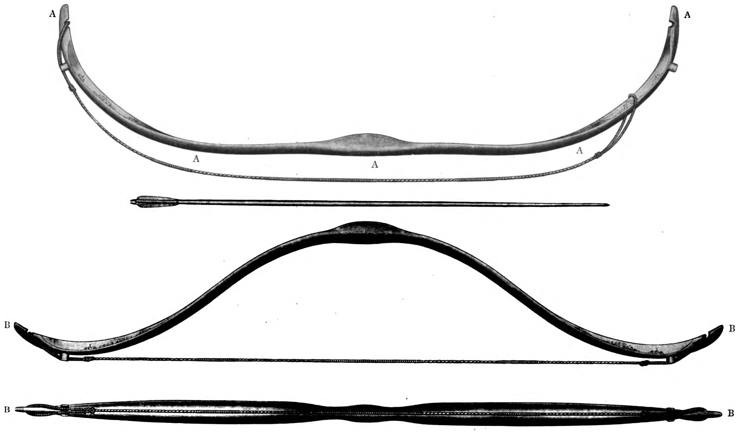 It should not be supposed, however, that because these bows were so diminutive in size, they were mere playthings for shooting a flight arrow to an immense range. They were powerful weapons of warfare, and, as I have proved in practice, those of only moderate power are capable of sending an iron-shod arrow weighing 5s., or one ounce, to a distance of 280 yards. Bows that could shoot a flight arrow 600 yards, and more, would certainly be able to drive an ounce arrow 360 to 400 yards—or much farther than was possible with the old English longbow and its war shaft.