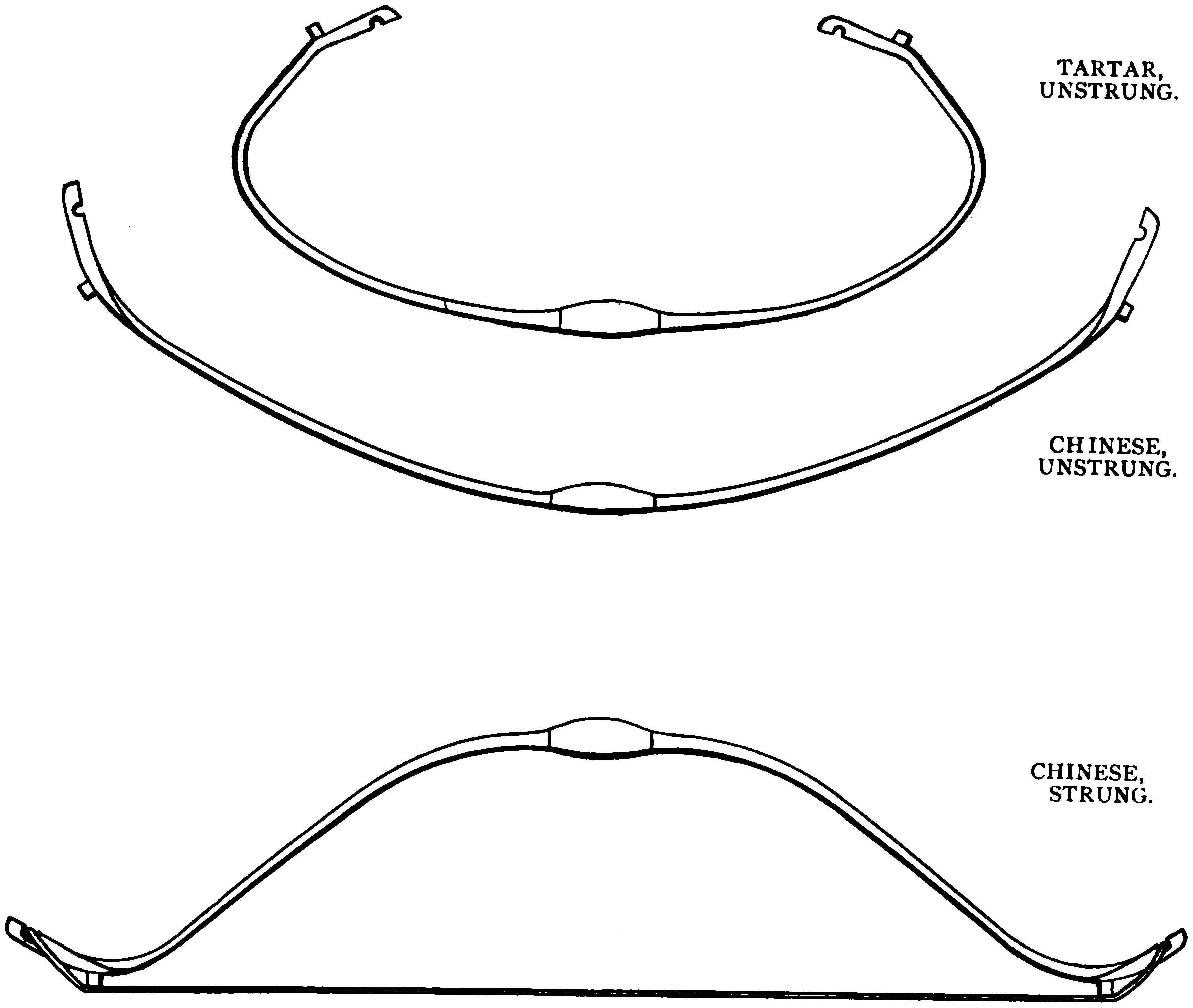 The great Chinese or Tartar bow requires a very long arrow, which from its length is, of necessity, a heavy one with a thick shaft. It cannot be propelled, as a result, farther than from 250 to 260 yards. One distinctive feature of Chinese, Tartar, Persian or Indian bows is the formation of their bow-strings. These are invariably from ¼ to 5/16 in. in thickness, and are always closely wrapped round, from end to end, with soft cord or coloured silk of about the substance of worsted.