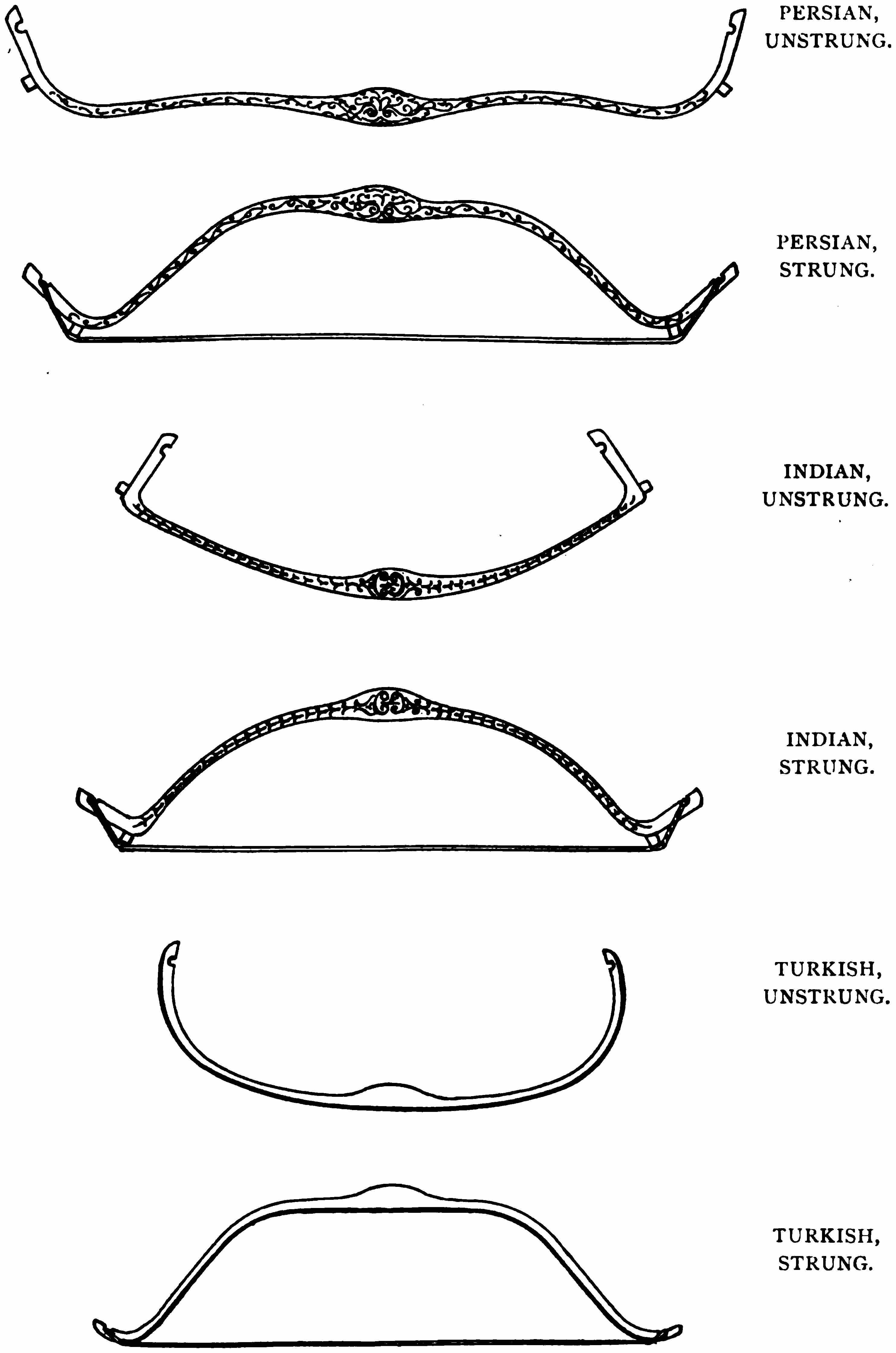 Though the range of the Turkish bow—whether with a flighting or with a war arrow—far exceeds that of the other bows depicted, yet the Persian and Indian weapons are capable of shooting to a long distance, certainly much farther than any European longbow.