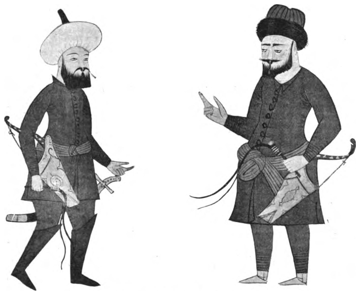 From an illuminated Turkish MS. in the Sloane Collection, B.M., dated 1621, No. 5258. These reproductions plainly show how small was the size of the bow formerly used in warfare by Turkish soldiers.
