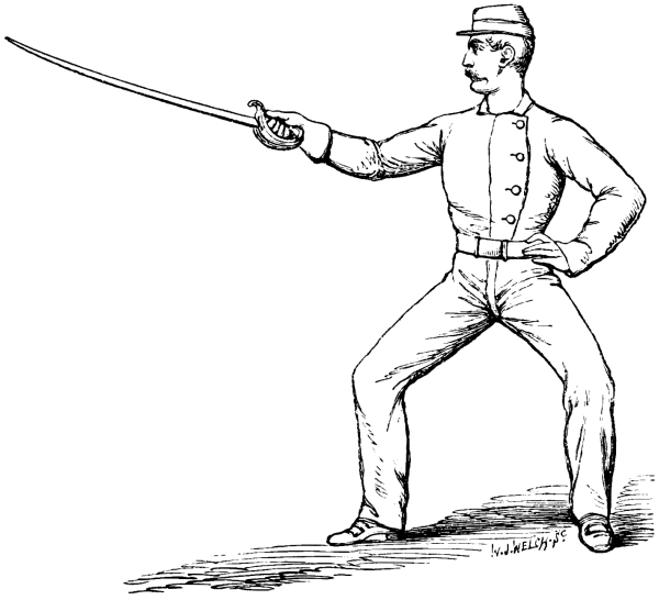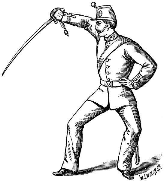 At the order, Stand on Guard, the recruit having assumed the Second Position, No. 2, falls on Guard: the pommel of the sword fronts his right breast; the point is directed at his opponent’s right eye; his right arm is extended with an easy bend at the elbow; the wrist is inclined, with the knuckles slightly turned upwards, to his own right, so as to cover him in case of a straight thrust, and the left hand is placed upon the left flank just below the ribs, with the fingers to the front and the thumb to the rear.