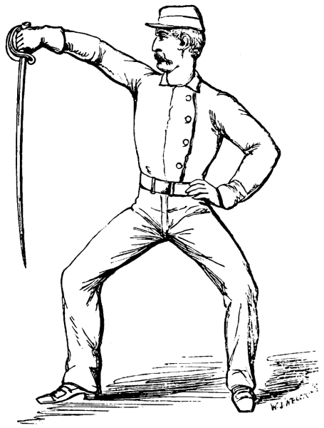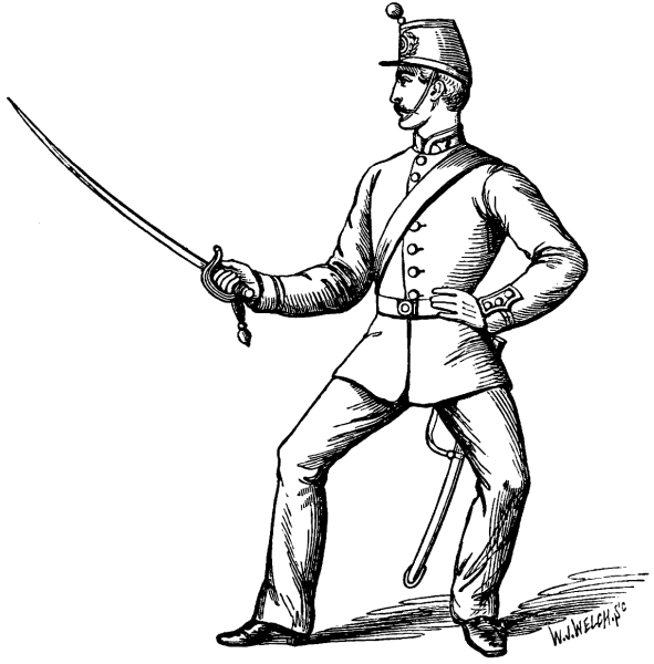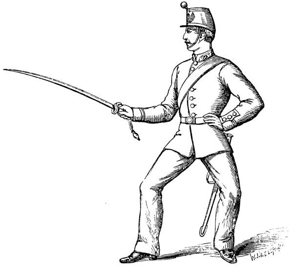 Nothing will here be said concerning the “goose step of the sword,” the “Balance Motions,” and the “Extension Motions,” of the official ‘Infantry Sword Exercise.’ They are essentially a part of ‘Squad and Setting-up Drill,’ and21 as such they have been treated in several good manuals, especially by Serjeant-Major S. Bertram Brown: A ‘Practical Guide to Squad and Setting-up Drill, in accordance with the Principles laid down in Part I., Field Exercise of the Army.’ Adapted for the use of Recruits, Rifle Volunteers, Militia, Police Force, Schools, and Families: Illustrated with sixty-eight figures, representing each Stick and Club Exercise, Extension Motions, and Sword Exercise Positions. London: Allen and Co., 1871. 2nd Edition.6 Considered in a wider sense they belong to the Branch of Science so thoroughly developed in ‘A Military System of Gymnastic Exercises for the Use of Instructors: Adjutant-General’s Office, Horse Guards, 1862; Physical Education,’ Clarendon Press Series, Oxford, 1869; and in ‘Training in Theory and Practice’ (London, Macmillan, 1874), by Archibald MacLaren,7 whose excellent code for the army, and whose22 influence with successive war ministers, as some one truly said, have aided largely in introducing that admirable training which is transforming the stiff, slow-moving grenadier of past times into the vigorous, rapid, and enduring soldier of the present day.