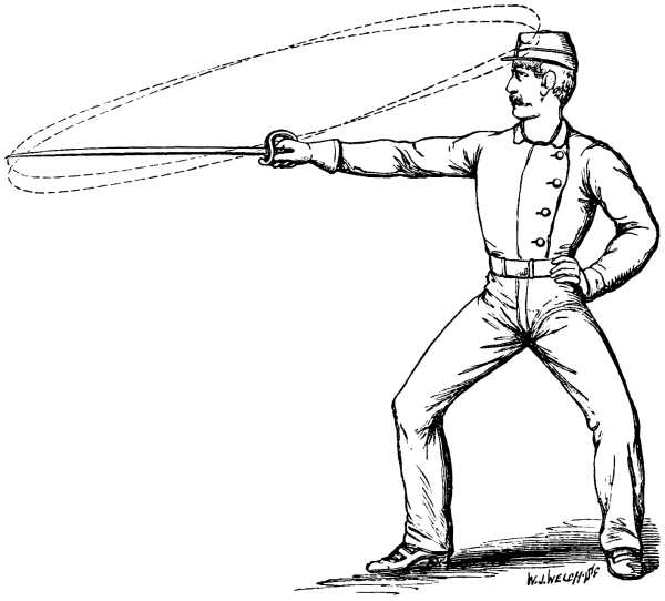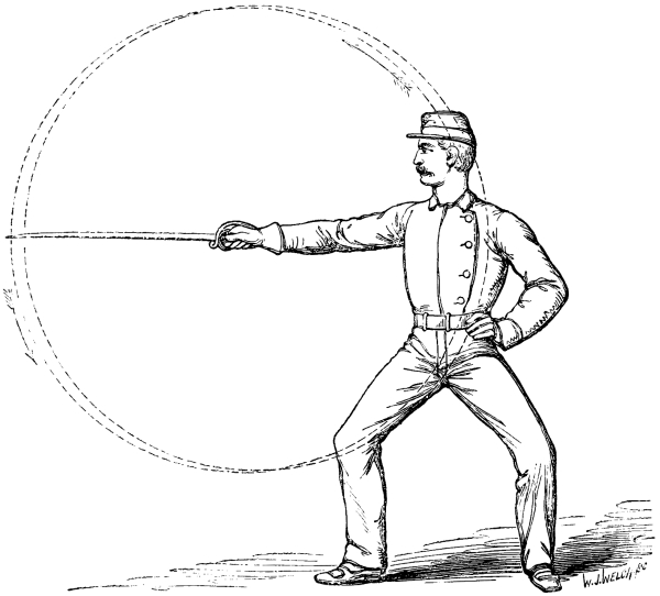 4. The Whip Cut; in which the arm and elbow are kept almost motionless, and the blow is delivered from the wrist. This is the principal Cut allowed in my system; it is capable of sufficient effect upon the opponent whilst it does not uncover the swordsman who uses it.