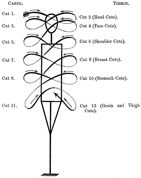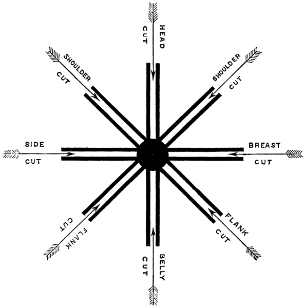 1. The Chopping or Downright Cut, from the shoulder and fore-arm. This appears to be the instinctive method preserved by Europe; most men who take up a sword for the first time use it in this way.