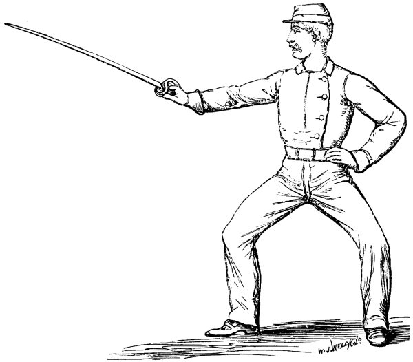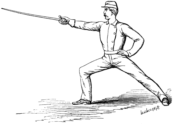 These movements must be learned, first in slow, and afterwards in quick and in double-quick, time; the same may be said of all practice with and without the sword. Squad attention! and Stand at Ease! need hardly be explained. The recruits’ muscles soon become fatigued by the unusual and monotonous exercise, causing them to remain too long in one position; the easiest way to relieve them is to change front, making the left leg stand on guard and lunge, as a left-handed fencer would do. This double practice is as useful and recommendable in fencing and broadsword play as25 in bayonet exercise: it gives additional balance to the body, it equalizes the muscular strength of both sides, and it makes the soldier feel that if his right arm be disabled he can still depend upon his left.