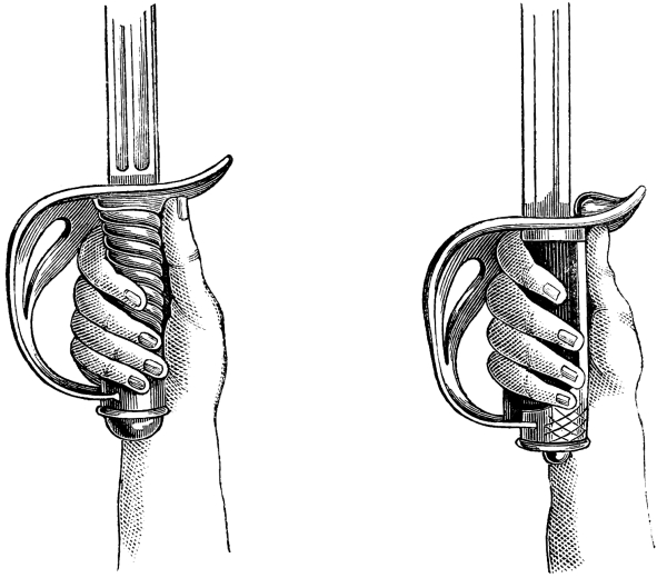 The “Cuts” will be noticed in a future page. Of the grip I may remark that the one essential, the position of the thumb, both in attacks and parries is, as a rule, neglected by the ‘Sword Exercise.’1 As early as 1828, Müller made his point d’appui a grasp of the handle with the four fingers, the thumb being stretched along the back, in order to direct the edge, and to avoid the possibility of striking with the “flat.” The only exception to this universal law is when doing the “Moulinet” movements, which will be explained farther on. Some professors, both with broadsword and small-sword, would stretch the index, when pointing, along the right of the handle. I have objected to this practice in the rapier and the foil: except when done to change position for relief, it serves merely to fatigue the wrist. But the proper use of the thumb, “le pouce allongé sur le dos de la poignée,” which is troublesome at first, and which demands some study, especially from those who have acquired bad habits, is the base of all superior “counterpoint.”2