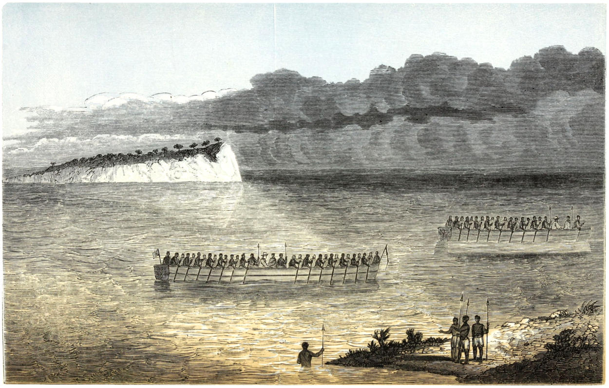 We left Kinawani on the next morning, and striking away from the river we crossed rugged and rolling ground, divided by deep swamps of mire and grass. [36] To the southward ran the stream, rushing violently down a rocky bed, with tall trees lining its banks. Sailing before the morning east-wind, a huge mass of nimbus occupied the sky, and presently discharged itself in an unusually heavy downfall: during the afternoon the breeze veered as usual to the west, and the hot sunshine was for once enjoyable. After a weary trudge of five hours and twenty minutes, we entered a large and comfortable kraal, situated near a reach where the swift and turbid river foamed over a discontinuous ledge of rock, between avenues of dense and tangled jungle. No provisions were procurable at this place; man appeared to have become extinct.
