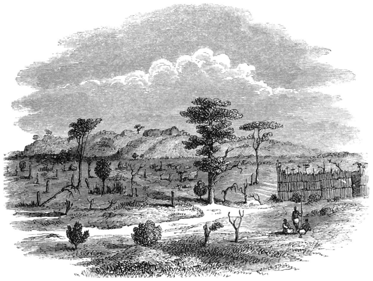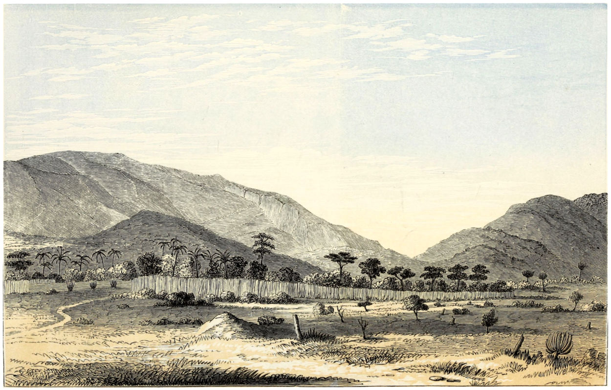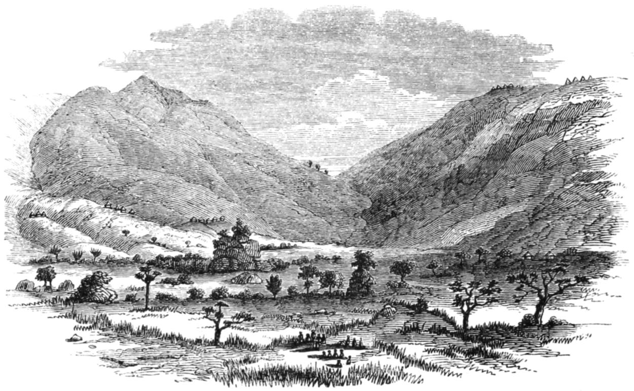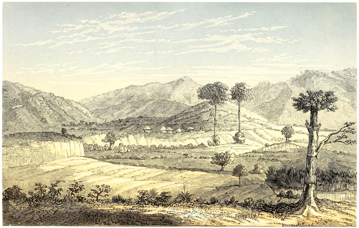 The Land of the Moon, which is the garden of Central Intertropical Africa, presents an aspect of peaceful rural beauty which soothes the eye like a medicine after the red glare of barren Ugogo, and the dark monotonous verdure of the western provinces. The inhabitants are comparatively numerous in the villages, which rise at short intervals above their impervious walls of the lustrous green milk-bush, with its coral-shaped arms, variegating the well-hoed plains; whilst in the pasture-lands frequent herds of many-coloured cattle, plump, round-barrelled, and high-humped, like the Indian breeds, and mingled flocks of goats and sheep dispersed over the landscape, suggest ideas of barbarous comfort and plenty. There are few scenes more soft and soothing than a view of Unyamwezi in the balmy evenings of spring. As the large yellow sun nears the horizon, a deep stillness falls upon earth: even the zephyr seems to lose the power of rustling the lightest leaf. The milky haze of midday disappears from the firmament, the flush of departing day mantles the distant features of scenery with a lovely rose-tint, and the twilight is an orange glow that burns like distant horizontal fires, passing upwards through an imperceptibly graduated scale of colours—saffron, yellow, tender green, and the lightest azure—into the dark blue of the infinite space above. The charm of the hour seems to affect even the unimaginative Africans, as they sit in the central spaces of their villages, or, stretched under the forest-trees, gaze upon the glories around.