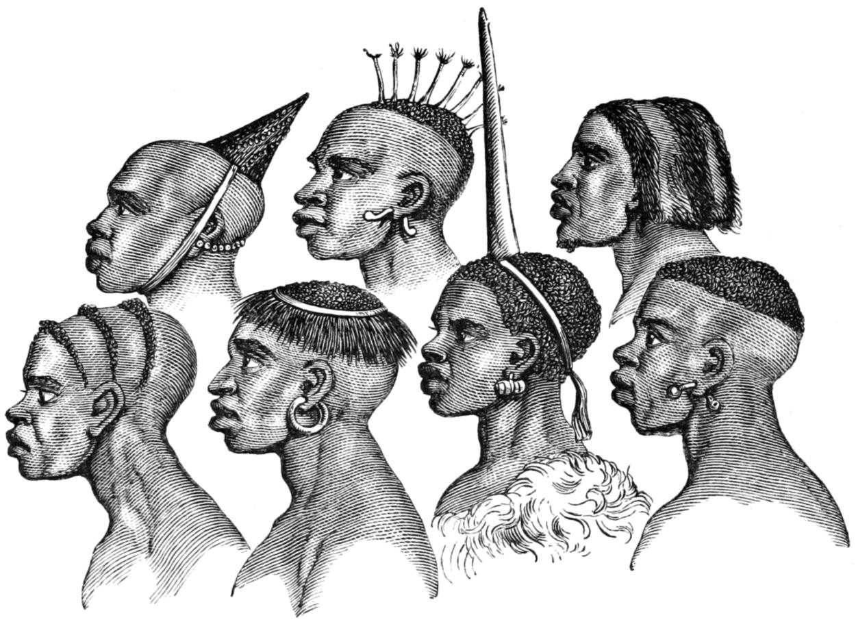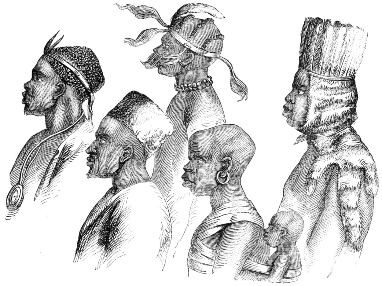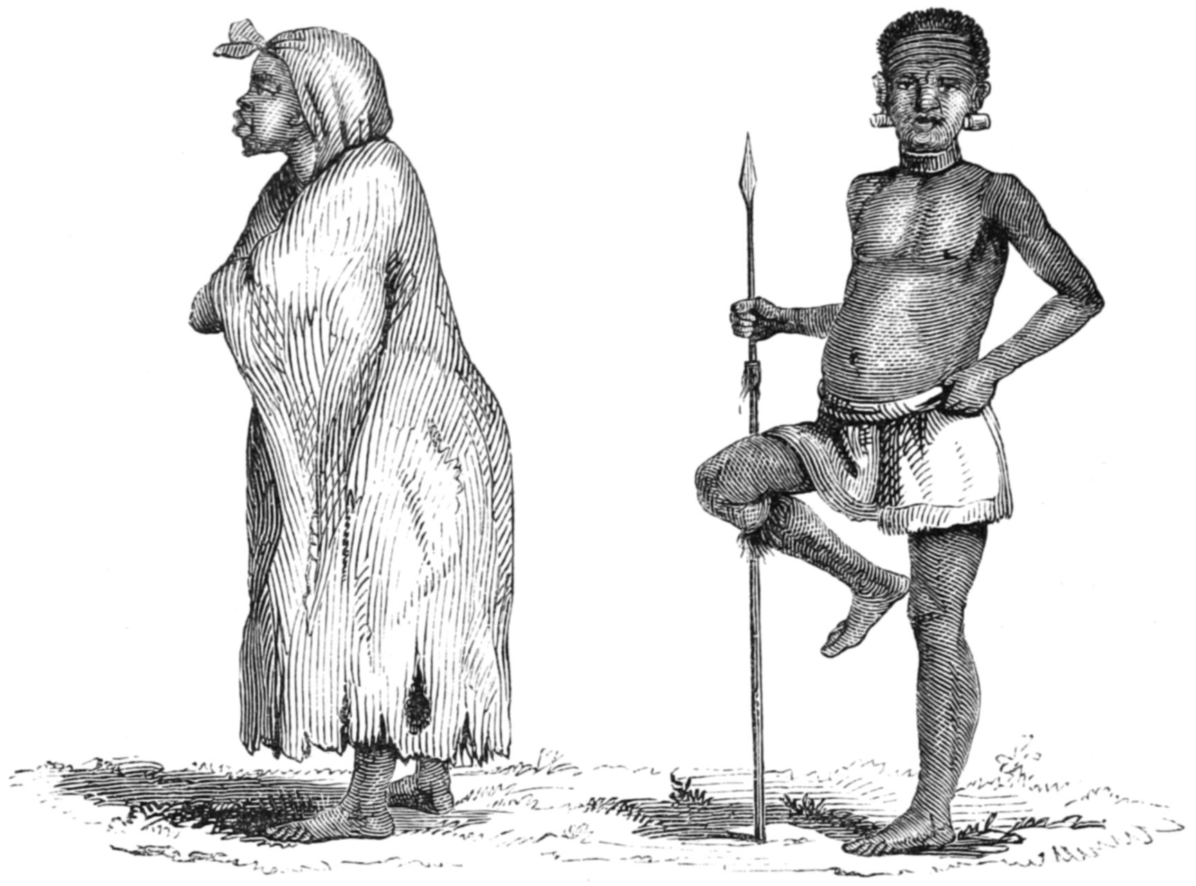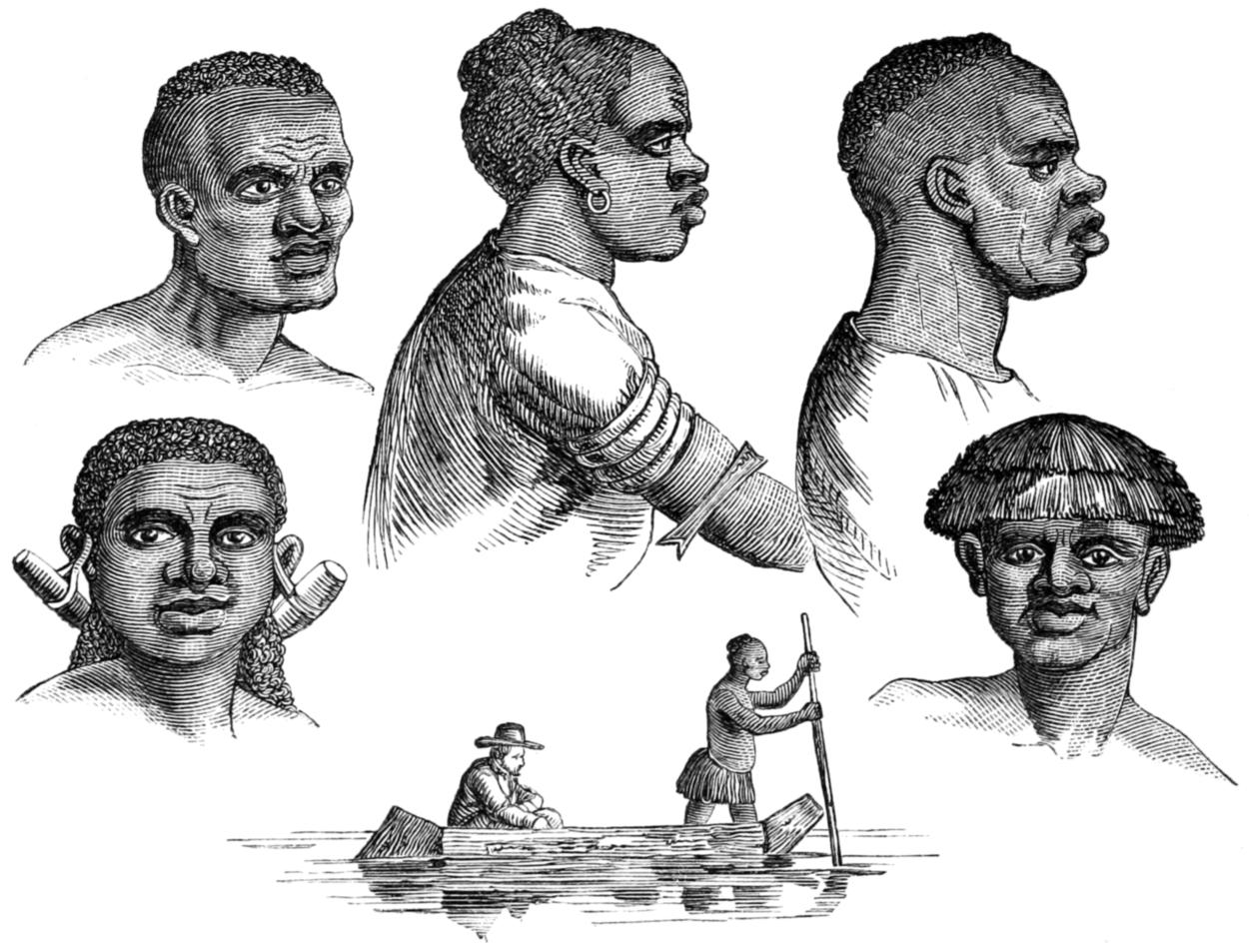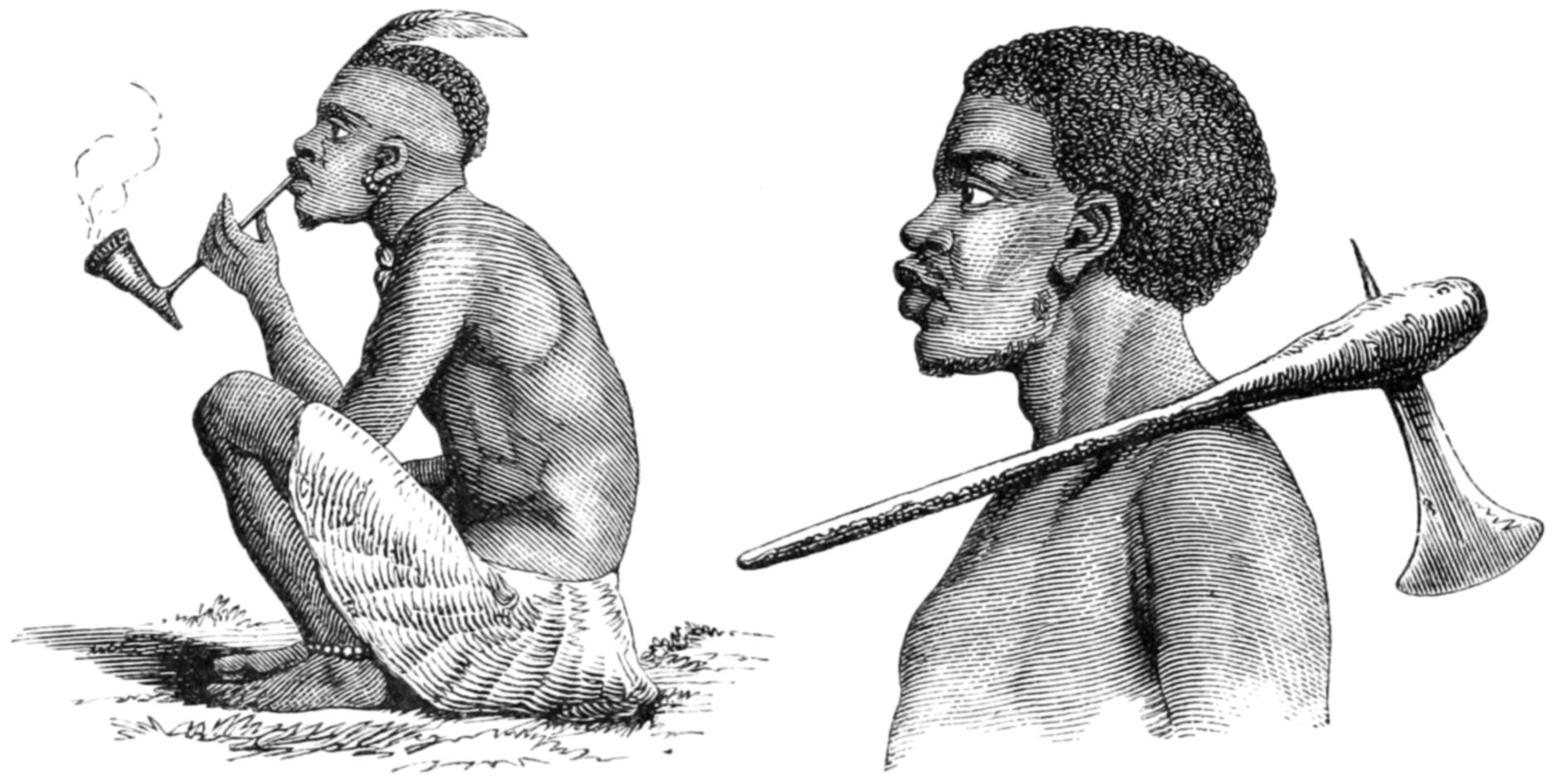 The aspect of the Wanyamwezi is alone sufficient to disprove the existence of very elevated lands in this part of the African interior. They are usually of a dark sepia-brown, rarely coloured like diluted Indian ink, as are the Wahiao and slave races to the south, with negroid features markedly less Semitic than the people of the eastern coast. The effluvium from their skins, especially after exercise or excitement, marks their connection with the negro. The hair curls crisply, but it grows to the length of four or five inches before it splits; it is usually twisted into many little ringlets or hanks; it hangs down like a fringe to the neck, and is combed off the forehead after the manner of the [21] ancient Egyptians and the modern Hottentots. The beard is thin and short, there are no whiskers, and the moustachio—when not plucked out—is scant and straggling. Most of the men and almost all the women remove the eyelashes, and pilar hair rarely appears to grow. The normal figure of the race is tall and stout, and the women are remarkable for the elongation of the mammary organs. Few have small waists, and the only lean men in the land are the youths, the sick, and the famished. This race is said to be long-lived, and it is not deficient in bodily strength and savage courage. The clan-mark is a double line of little cuts, like the marks of cupping, made by a friend with a knife or razor, along the temporal fossæ from the external edges of the eyebrows to the middle of the cheeks or to the lower jaws. Sometimes a third line, or a band of three small lines, is drawn down the forehead to the bridge of the nose. The men prefer a black, charcoal being the substance generally used, the women a blue colour, and the latter sometimes ornament their faces with little perpendicular scars below the eyes. They do not file the teeth into a saw-shape as seen amongst the southern races, but they generally form an inner triangular or wedge-shaped aperture by chipping away the internal corners of the two front incisors like the Damaras, and the women extract the lower central teeth. Both sexes enlarge the lobes of the ears. In many parts of the country skins are more commonly worn than cloth, except by the Sultans and the wealthier classes. The women wear the long tobe of the coast, tightly wrapped round either above or more commonly below the breast; the poorer classes veil the bosom with a square or softened skin; the remainder of the dress is a kilt or short petticoat of the same material extending from [22] waist to knee. Maidens never cover the breast, and children are rarely clothed; the infant, as usual in East Africa, is carried in a skin fastened by thongs behind the parent’s back. The favourite ornaments are beads, of which the red coral, the pink, and the “pigeon-eggs” made at Nuremberg are preferred. From the neck depend strings of beads with kiwangwa, disks of shell brought from the coast, and crescents of hippopotamus teeth country made, and when the beard is long it is strung with red and particoloured beads. Brass and copper bangles or massive rings are worn upon the wrists, the forearm bears the ponderous kitindi or coil bracelet, and the arm above the elbow is sometimes decorated with circlets of ivory or with a razor in an ivory étui; the middle is girt with a coil of wire twisted round a rope of hair or fibre, and the ankles are covered with small iron bells and the rings of thin brass, copper, or iron wire, called sambo. When travelling, a goat’s horn, used as a bugle, is secured over the right shoulder by a lanyard and allowed to hang by the left side: in the house many wear a smaller article of the same kind, hollowed inside and containing various articles intended as charms, and consecrated by the Mganga or medicine-man. The arms are slender assegais with the shoulders of the blade rounded off: they are delivered, as by the Somal, with the thumb and forefinger after a preliminary of vibratory motion, but the people want the force and the dexterity of the Kafirs. Some have large spears for thrusting, and men rarely leave the hut without their bows and arrows, the latter unpoisoned, but curiously and cruelly barbed. They make also the long double-edged knives called sime, and different complications of rungu or knob-kerries, some of them armed with an iron lance-head upon the wooden bulge. [23] Dwarf battle-axes are also seen, but not so frequently as amongst the western races on the Tanganyika Lake. The shield in Unyamwezi resembles that of Usagara; it is however rarely used.