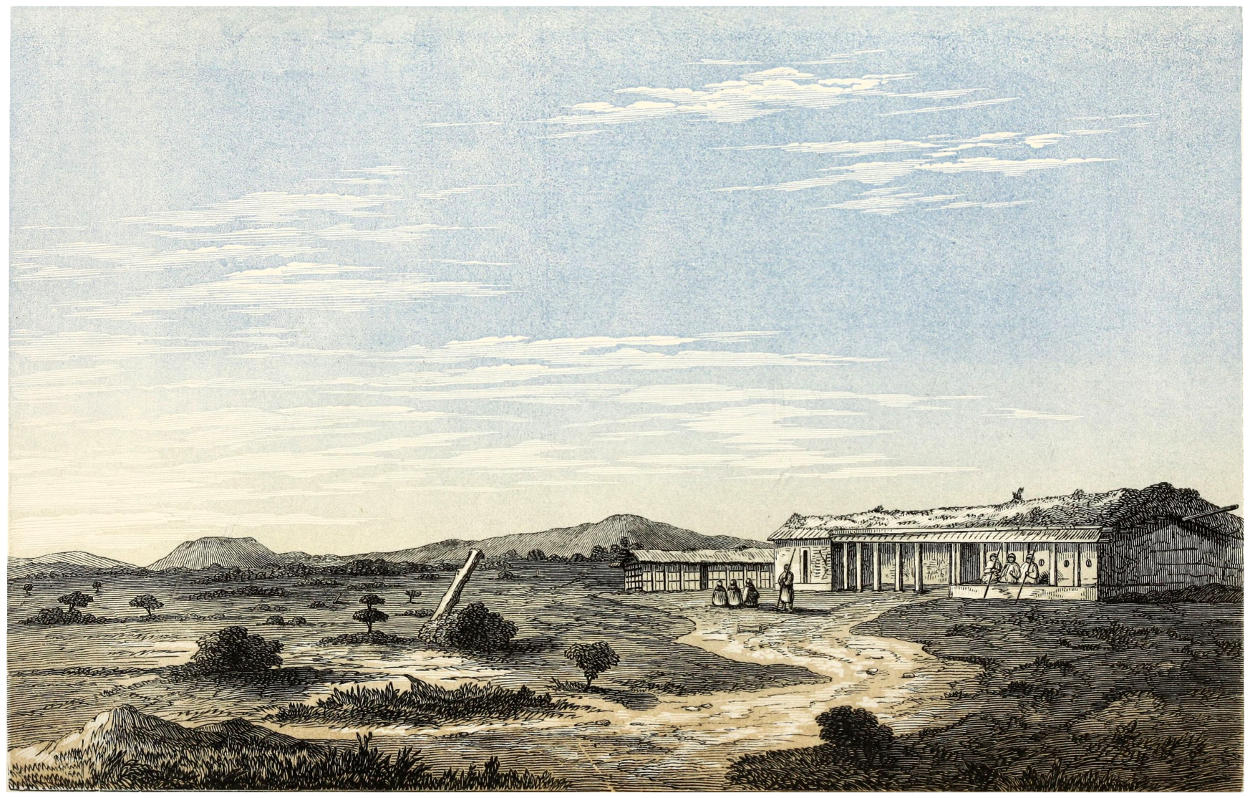 In Unyamwezi water generally lies upon the surface, during the rains, in broad shallow pools, which become favourite sites for rice-fields. These little ziwa and mbuga—ponds and marshes—vary from two to five [8] feet below the level of the land; in the dry season they are betrayed from afar by a green line of livelier vegetation streaking the dead tawny plain. The Arabs seldom dig their wells deeper than six feet, and they complain of the want of “live-water” gushing from the rocky ground, as in their native Oman. The country contains few springs, and the surface of retentive clay prevents the moisture penetrating to the subsoil. The peculiarity of the produce is its decided chalybeate flavour. The versant of the country varies. The eastern third, falling to the south-east, discharges its surplus supplies through the Rwaha river into the Indian Ocean; in the centre, water seems to stagnate; and in the western third, the flow, turning to the north and north-west, is carried by the Gombe nullah—a string of pools during the dry season, and a rapid unfordable stream during the rains—into the great Malagarazi river, the principal eastern influent of the Tanganyika Lake. The levels of the country and the direction of the waters combine to prove that the great depression of Central Africa, alluded to in the preceding chapter, commences in the district of Kigwa in Unyamwezi.