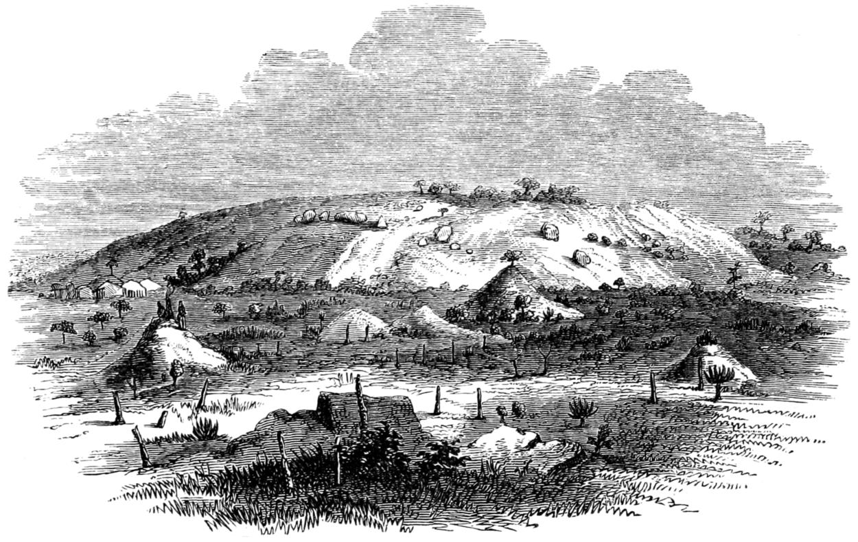 The general character of Unyamwezi is rolling ground, intersected with low conical and tabular hills, whose lines ramify in all directions. No mountain is found in the country. The superjacent stratum is clay, overlying the sandstone based upon various granites, which in some places crop out, picturesquely disposed in blocks and boulders and huge domes and lumpy masses; ironstone is met with at a depth varying from five to twelve feet, and at Kazeh, the Arab settlement in Unyanyembe, bits of coarse ore were found by digging not more than four feet in a chance spot. During the rains a coat of many-tinted greens conceals the soil; in the dry season the land is grey, lighted up by golden stubbles and dotted with wind-distorted trees, shallow swamps of emerald grass, and wide sheets of dark mud. Dwarfed stumps and charred “black-jacks” deform the fields, which are sometimes ditched or hedged in, whilst a thin forest of parachute-shaped thorns diversifies the waves of rolling land and earth-hills spotted with sun-burnt stone. The reclaimed tracts and clearings are divided from one another by strips of primæval jungle, varying from two to twelve miles in length. As in most parts of Eastern Africa, the country is dotted with “fairy mounts”—dwarf mounds, the ancient sites of trees now crumbled to dust, and the débris of insect architecture; they appear to be rich ground, as they are always diligently cultivated. The yield of the soil, according to the Arabs, averages sixty-fold, even in unfavourable seasons.