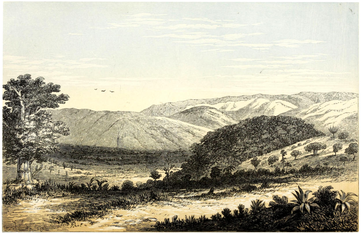 The rainy monsoon is here ushered in, accompanied, and terminated by storms of thunder and lightning, and occasional hail-falls. The blinding flashes of white, yellow, or rose colour play over the firmament uninterruptedly for hours, during which no darkness is visible. In the lighter storms thirty and thirty-five flashes may be counted in a minute: so vivid is the glare that it discloses the finest shades of colour, and appears followed by a thick and palpable gloom, such as would hang before a blind man’s eyes, whilst a deafening roar simultaneously following the flash, seems to travel, as it were, to and fro overhead. Several claps sometimes sound almost at the same moment, and as if coming from different directions. The same storm will, after the most violent of its discharges, pass over, and be immediately followed by a second, showing the superabundance of electricity in the atmosphere. When hail is about to fall, a rushing noise is heard in the air, with sudden coolness and a strange darkness from the [10] canopy of brownish purple clouds. The winds are exceedingly variable: perhaps they are most often from the east and north-east during summer, from the north-west and south-west in the rains; but they are answered from all quarters of the heavens, and the most violent storms sail up against the lower atmospheric currents. The Portuguese of the Mozambique attribute these terrible discharges of electricity to the quantity of mineral substances scattered about the country; but a steaming land like Eastern Africa wants, during the rains, no stronger battery. In the rainy season the sensation is that experienced during the equinoctial gales in the Mediterranean, where the scirocco diffuses everywhere discomfort and disease. The fall is not, as in Western India, a steady downpour, lasting sometimes two or three days without a break. In Central Africa, rain seldom endures beyond twelve hours, and it often assumes for weeks an appearance of regularity, re-occurring at a certain time. Night is its normal season; the mornings are often wet, and the torrid midday is generally dry. As in Southern Africa, a considerable decrease of temperature is the consequence of long-continued rain. Westward of Unyanyembe, hail-storms, during the rainy monsoon, are frequent and violent; according to the Arabs, the stones sometimes rival pigeons’ eggs in size. Throughout this monsoon the sun burns with sickly depressing rays, which make earth reek like a garment hung out to dry. Yet this is not considered the unhealthy period: the inundation is too deep, and evaporation is yet unable to extract sufficient poison from decay.