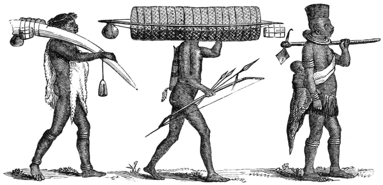 The Wanyamwezi have won for themselves a reputation by their commercial industry. Encouraged by the merchants, they are the only professional porters of [30] East Africa; and even amongst them, the Wakalaganza, Wasumbwa, and Wasukuma are the only tribes who regularly visit the coast in this capacity. They are now no longer “honest and civil to strangers”—semi-civilisation has hitherto tended to degradation. They seem to have learned but little by their intercourse with the Arabs. Commerce with them is still in its infancy. They have no idea of credit, although in Karagwah and the northern kingdoms payment may be delayed for a period of two years. They cannot, like some of their neighbours, bargain: a man names the article which he requires, and if it be not forthcoming he will take no other. The porters, who linger upon the coast or in the island of Zanzibar, either cut grass for asses, carry stones and mortar to the town, for which they receive a daily hire of from two to eight pice, or they obtain from the larger landholders permission to reclaim and cultivate a plot of ground for vegetables and manioc. They have little of the literature, songs and tales, common amongst barbarians; and though they occasionally indulge in speeches, they do not, like many kindred tribes, cultivate eloquence. On the march they beguile themselves with chanting for hours together half a dozen words eternally repeated. Their language is copious but confused, and they are immoderately fond of simple and meaningless syllables used as interjections. Their industry is confined to weaving coarse cloths of unbleached cotton, neatly-woven baskets, wooden milk-bowls, saddle-bags for their asses, and arms. They rear asses and load them lightly when travelling to the coast, but they have not yet learned to ride them. Though they carefully fence and ditch their fields, they have never invented a plough, confining themselves to ridging the land with the laborious [31] hoe. They rarely sell one another, nor do they much encourage the desertion of slaves. The wild bondsman, when running away, is sometimes appropriated by his captor, but a Muwallid or domestic slave is always restored after a month or two. The Arabs prefer to purchase men sold under suspicion of magic; they rarely flee, fearing lest their countrymen should put them to death.