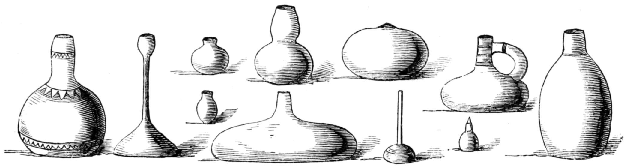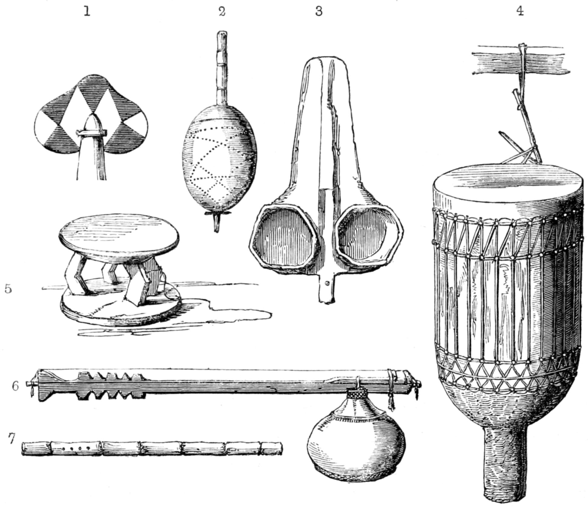 In Unyamwezi the sexes do not eat together: even the boys would disdain to be seen sitting at meat with their mothers. The men feed either in their cottages or more generally in the İwánzá: they make, when they can, two meals during the day—in the morning, a breakfast, which is often omitted for economy, and a dinner about 3 P.M. During the interim they chew tobacco, and, that failing, indulge in a quid of clay. It probably contains some animal matter, but the chief reason for using it is apparently the necessity to barbarians of whiling away the time when not sleeping by exercising their jaws. They prefer the “sweet earth,” that is to say, the clay of ant-hills: the Arabs have tried it without [29] other effects but nausea. The custom, however, is not uncommon upon both coasts of Africa: it takes, in fact, the place of the mastic of Chios, the kat of Yemen, the betel and toasted grains of India and the farther East, and the ashes of the Somali country. The Wanyamwezi, and indeed the East-African tribes generally, have some curious food prejudices. Before their closer intercourse with the Arabs they used to keep poultry, but, like the Gallas and the Somal, who look upon the fowl as a kind of vulture, they would not eat it: even in the present day they avoid eggs. Some will devour animals that have died of disease, and carrion,—the flesh of lions and leopards, elephants and rhinoceroses, asses, wild cats and rats, beetles and white ants;—others refuse to touch mutton or clean water-fowl, declaring that it is not their custom. The prejudice has not, however, been reduced to a system, as amongst the tribes of southern Africa. They rarely taste meat except upon the march, where the prospect of gain excites them to an unusual indulgence: when a bullock is killed, they either jerk the meat, or dry it upon a dwarf platform of sticks raised above a slow and smoky fire, after which it will keep for some days. The usual food is the ugali or porridge of boiled flour: they find, however, a variety of edible herbs in the jungle, and during the season they luxuriate upon honey and sour milk. No Mnyamwezi, however, will own to repletion unless he has “sat upon pombe,”—in other words, has drunk to intoxication; and the chiefs pride themselves upon living entirely upon beef and stimulants.