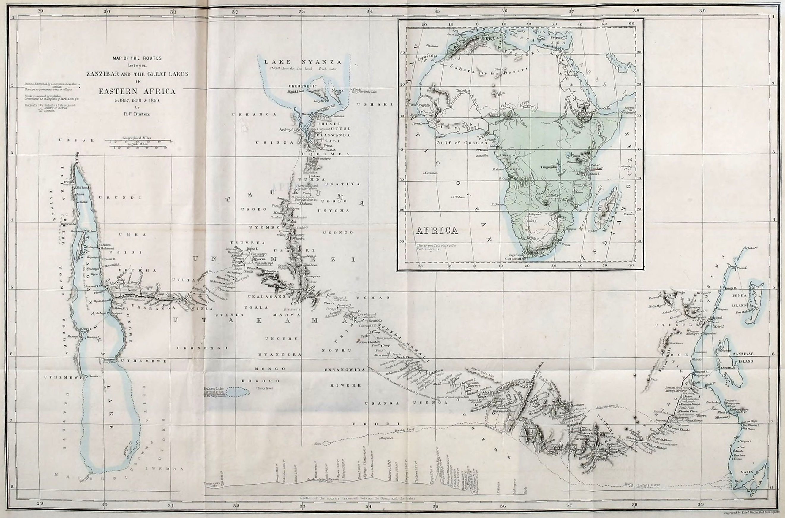 The fourth division is a hilly table-land, extending from the western skirts of the desert Mgunda Mk’hali, in E. long. 33° 57′, to the eastern banks of the Malagarazi River, in E. long. 31° 10′: it thus stretches [2] diagonally over 155 rectilinear geographical miles. Bounded on the north by Usui and the Nyanza Lake, to the south-eastwards by Ugala, southwards by Ukimbu, and south-westwards by Uwende, it has a depth of from twenty-five to thirty marches. Native caravans, if lightly laden, can accomplish it in twenty-five days, including four halts. The maximum altitude observed by B. P. therm. was 4050 feet, the minimum 2850. This region contains the two great divisions of Unyamwezi and Uvinza.