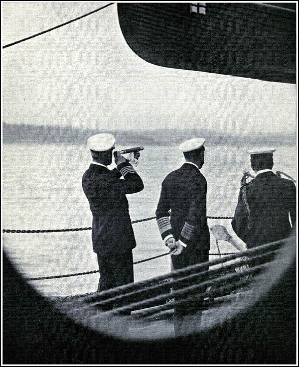 During the few months that I was on the personal[380] Staff of King George, I came in for one very interesting experience. Towards the end of the summer I was in attendance when the King, Queen Mary, and some of the younger members of the Royal Family, embarked on board the Royal Yacht for the purpose of witnessing the manœuvres of the Home Fleet, then under the command of the present Admiral of the Fleet Sir Edward May. During these exercises the headquarters of the Fleet was Torbay, and there the Victoria and Albert generally anchored for the night, or remained during the day, while the King was on board one of the battleships of the Fleet. Though it is many years since I have served afloat, it is, even to this day, impossible for me to stand on the quarter-deck of a man-of-war without the sensation of being amongst familiar surroundings, so those days spent in the midst of old comrades were very pleasant ones, and remain to me as a very happy memory. I believe it was during that week that an aeroplane flew for the first time over a British Fleet. The plane in question was piloted by one of the pioneers of flying, who was giving an exhibition of aviation, and, naturally, seized such an opportunity as being the first man to fly over a British Fleet, a Fleet, moreover, that had the Royal Standard flying at a masthead. I have still among my belongings the photograph, here reproduced, of the King on the bridge of the flagship watching the movement of the plane as it approaches.