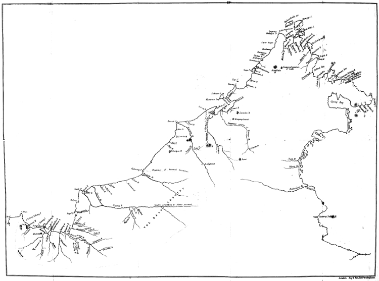 I will add a few words respecting the maps. The one of the districts around Kina Balu was constructed from the observations made during our two expeditions to that mountain. The map of the Limbang and Baram rivers is the result of many observations, and with regard to the position of the main mountains, I think substantially correct, as they were fixed with the aid of the best instruments. The third map is inserted in order to give a general idea of the North-West Coast, though the run of the rivers is often laid down by conjecture.