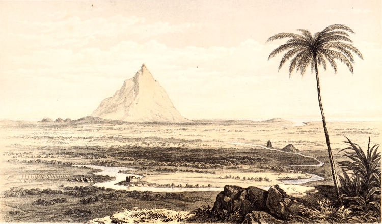 Cape Unsang is low and marked by few characteristic features, but on rounding the point becomes steadily prettier until we reach the Tungku river, when it presents a beautiful succession of low hills with the mountain of Siriki to the left, which is a good mark to discover the pirate haunt of Tungku. All the small rivers on the southern shore of Cape Unsang are barred, not admitting a ship’s barge at low-water—at least, we did not find deeper channels. I saw here a shark, the largest I have ever noticed: it swam to and fro in the shallow water, eyeing the English seamen who were dragging their boats over the sands, but it did not venture near enough to be dangerous. We were sitting in the gig a little to seaward and it passed and repassed within a few[398] yards of us, and I thought it must have been fifteen feet in length, but the imagination is apt to wander on such occasions, and as it swam in very shallow water, it appeared to show more of its back than usual. As the officers and men were on particular service, no one attempted to put a ball into it. Tungku appeared a type of the neighbouring districts: near the sea it is flat, occasionally varied by a low hill. I walked several hours through this country, and never before saw more luxuriant crops; the rice stalks were over our heads, the sugar cane was of enormous girth, and the pepper vines had a most flourishing appearance: the soil must be of the very finest quality.
