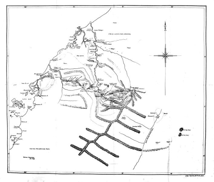 [21] I have inserted this chapter, though, in fact, it contains but a summary of the geographical information collected during our two expeditions to Kina Balu, and some previous coasting voyages. It necessarily involves repetition, but I hope will prove useful to geographers who may be desirous to have the subject presented to them in one view, and it will help to elucidate the accompanying map. To render it more complete, I have added a geographical description of Maludu Bay and the north-east coast of Borneo.