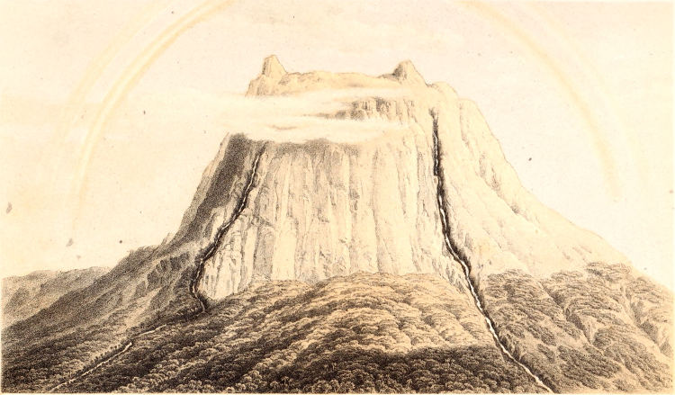 I will add a few remarks on the geology of these districts, premising them, however, by the observation that I am ignorant of the science. Wherever the rocks protruded through the hills, we noticed they were decomposing sandstone; and this character continued until we reached the great mountain. Occasionally, as in Gaya island, the rocks were of a harder texture; and here a Mr. Molley is said to have been shown a vein of coal. In the districts to the west and south of the Tampasuk, we noticed no signs of primitive rock; while in the Tampasuk river, huge boulders of granite are met with a little above Butong, while the debris extends as far as the junction; but the rocks of the hills are sandstone, and this character continues to the base of the mountain. At Koung, the rocks dipped to the south-west by south, at an angle of 45°. On the Marei Parei spur, we could trace the sandstone to the height of about 4,000 feet, the dip about 80° to the south-west; greenstone immediately after protruded, and appeared to form the chief rock. On the Marei Parei spur, the compass was so affected by the peroxide of iron which formed a sort of coating to the rocks, that it would not act. The main spur consists at first of sandstone; then of shale, almost as hard as stone; and of various rocks which I could not recognize; then of decomposing granite, above which commences the[385] massive outline of the summit. We found in our collection a piece of limestone that was broken off somewhere near the base of the mountain in the Kalupis valley.
