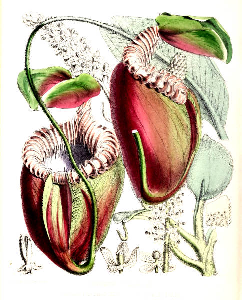 I must likewise draw attention to the exquisite manner in which the plates of the Nepenthes are coloured, and to the beauty of the engravings in general. They are admirably illustrative of the country, and do very great credit to the lithographers, Messrs. Day and Son, and to their excellent draughtsmen. I ought also to mention that the Nepenthes are drawn less than half the natural size, as it was found impracticable to introduce the full size without many folds, which would have speedily destroyed the beauty of the plates.