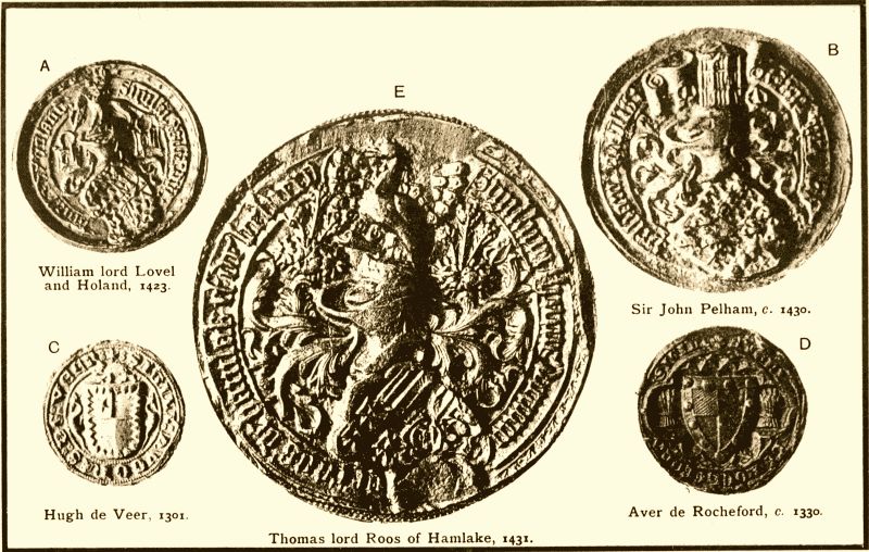 My thanks are due to the Society of Antiquaries of London for leave to reproduce the coloured illustrations in pls. I and II, for the loan of blocks or drawings of figs. 7, 13, 33, 64, 65, 101, 129, 153, 186, 187, 190, and 193, and for leave to photograph the[Pg 15] numerous casts of seals figured in pls. V-XIV and XVII-XXX and throughout the book; to the Royal Archæological Institute for loan of figs. 20 and 107; to the Sussex Archæological Society for the loan of fig. 142; to the Society of Arts for figs. 6, 15, 17, 28, 30, 41, 45, 46, 48, 51, 55, 73, 74, 86, 92, 114, 126, 127, 150, 154, 155, and 199; to the Royal Institute of British Architects for figs. 8, 93, and 199; to Messrs. Cassell & Co. for figs. 21, 53, 54, 56, 63, 81, 84, 85, 91, 108, 109, 117, 118, 124, 132, 133, 139, 151; to Messrs. Constable & Co. for figs. 9, 14, 43, 67, 68, 72, 75, 76, 77, 78, 83, 136, 137, 138; to Messrs. Parker & Co. for fig. 143; and to Messrs. Longmans & Co. for figs. 177, 183. Also to Mr. T. W. Rutter for lending the drawings reproduced in pls. II and III; to Mr. R. W. Paul for the drawing of fig. 184; to Mr. Mill Stephenson for the loan of the brass rubbings reproduced in figs. 19, 26, 27, 29, 31, 32, 35-39, 42, 146-148; to the Rev. T. W. Galpin, Mr. E. M. Beloe, and Mr. Aymer Vallance for the photographs of figs. 47, 149, and 191 respectively; and to the Rev. Severne Majendie for leave to photograph the effigies of the Duke and Duchess of Exeter (figs. 167, 168) in St. Katharine's chapel in Regent's Park.