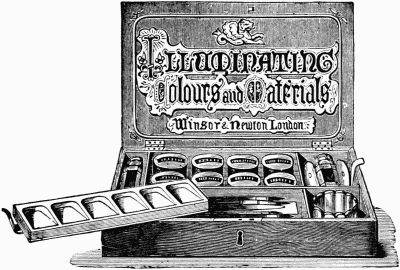 ILLUSTRATION OF "GUINEA" BOX OF MOIST COLOURS IN GLASS POTS, WITH MATERIALS