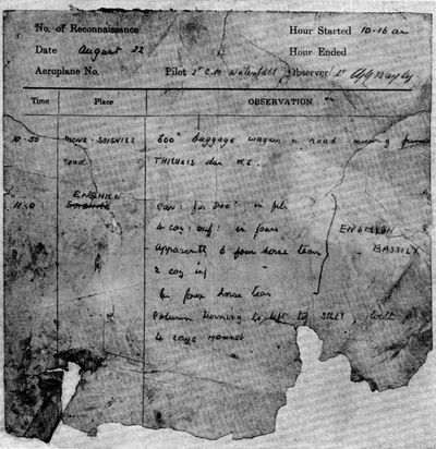 Observation of the battle. Advance of headquarters to Fère-en-Tardenois. General Joffre's thanks to the Flying Corps. Storm of September 12. The battle of the Aisne. Adventure of Lieutenants Dawes and Freeman. Position warfare. Artillery observation. Wireless—Lieutenants Lewis and James. An early (p. xvi) wireless message. The clock code. Popularity of wireless. Photography. The dropping of darts. German 'Archies'. The race for the sea. British army moves north; Flying Corps shifted to St. Omer. No. 6 Squadron arrives. Strategic reconnaissance. Long-distance flights. The battle of Ypres. Union Jack marking abolished. Photography and wireless. Earlier methods of ranging. Their inferiority. Fighting quality of British aeroplanes; German prisoners' evidence. The losses of Ypres. Withdrawal of German troops observed from the air. Sympathy of Flying Corps for the infantry. The German officer and his pilot.