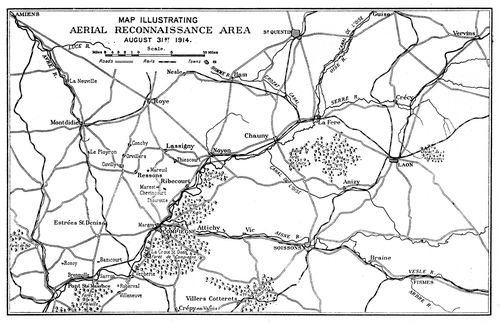 Among the points which were early brought home by the experience of the war to those who had control of the production of machines, one or two deserve special mention. The absolute necessity for an efficient fighting aeroplane was realized, it has been seen, within a month. The enormous value of artillery observation and the immense superiority of wireless telegraphy over all earlier and more rudimentary kinds of signalling were soon demonstrated, and the call for machines fitted with wireless became insistent. Some of the pilots and some of the equipment of the wireless section which existed before mobilization had been used to bring the squadrons of the expeditionary force up to war strength. The section, though much emaciated, was not allowed to lapse; it was attached to No. 4 Squadron, and went out with it to France. The pilots of this section, Lieutenants Lewis, James, and Winfield Smith, worked with the squadron, but spent most of their time in making ready the wireless telegraphy equipment which, when once the retreat was ended and ground stations were established on a fixed front, came into effective use. Again, the very rapid development of an efficient German anti-aircraft service, and the equally rapid improvement in range and accuracy of anti-aircraft guns, changed the conditions of reconnaissance. In the almost pastoral simplicity of the first days of the war, four thousand feet was held to be a sufficient height for immunity from the effect of fire from the ground. Before long four times that height gave no such immunity. Machines, therefore, had to be built to climb quickly, and had to be given a higher 'ceiling', as it is called; that is, they had to be able to maintain level flight in a more rarefied medium. But observation (p. 441) with the human eye from a height of several miles is almost useless for the detective work of military reconnaissance. So it came about that the improvement of the enemy's anti-aircraft artillery gave a direct impulse to the improvement of our aerial photography. A photograph, taken in a good light and enlarged, reveals many things invisible to the naked eye; a series of photographs reveals those changes in the appearance of the earth's surface which result from the digging of new trenches or gun-positions and the making of new ammunition-dumps.