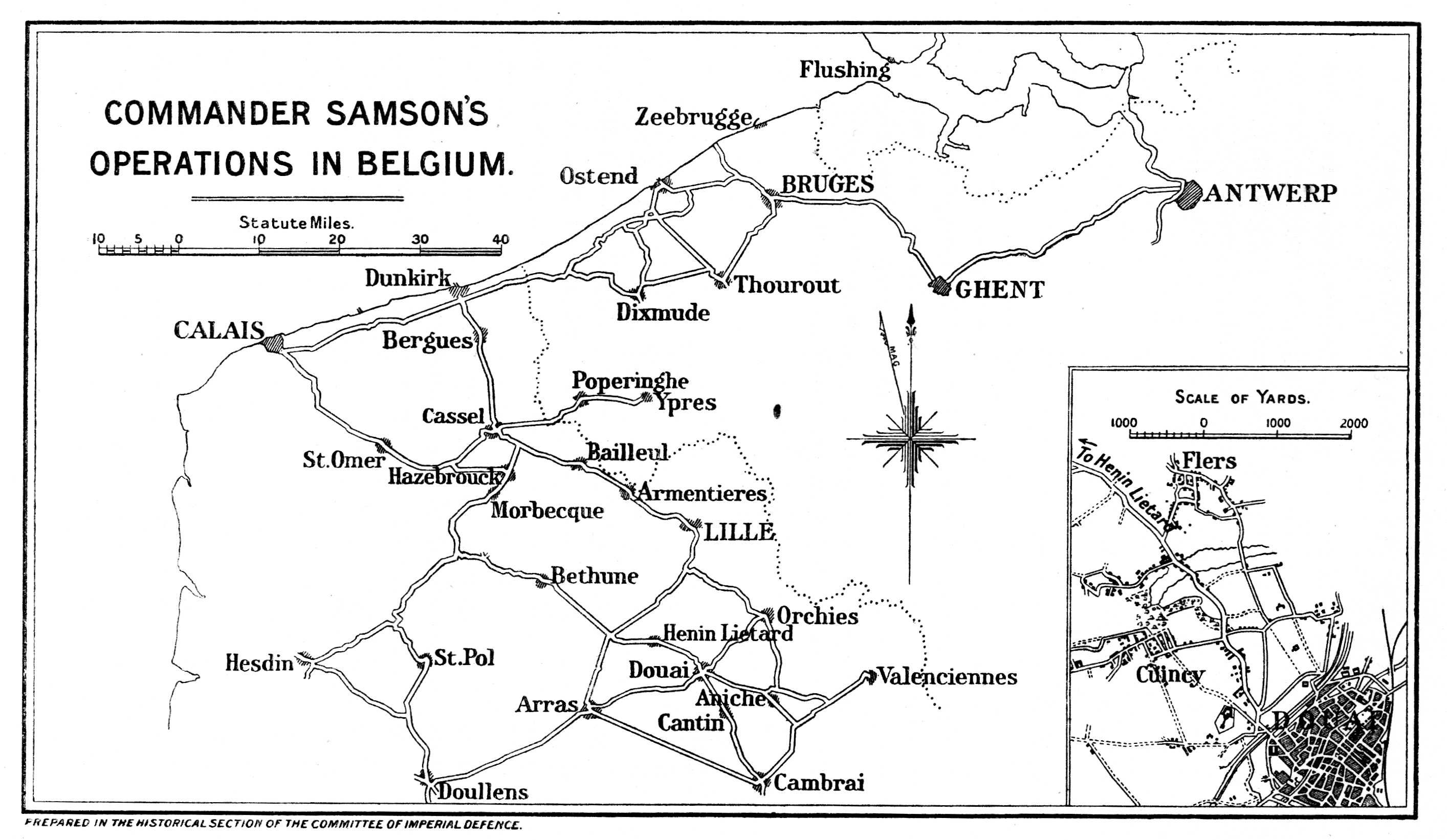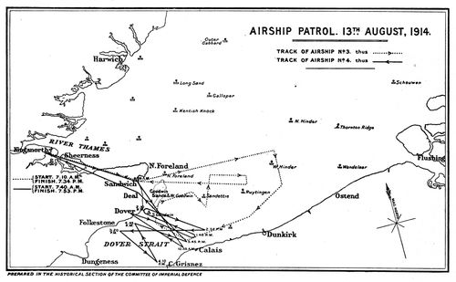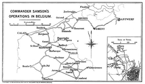 Strength of the Naval Wing. Progress in wireless and in armament. Uncertain purposes. The stimulant of war. Mr. F. K. McClean. Coastal patrols. Channel patrols. Airship logs. A Zeppelin sighted. Hardships of North Sea patrols. Squadron Commander Seddon's experience. Practice value of patrols. Seaplanes at Scapa Flow. Seaplane-carriers—Empress, Engadine, and Riviera. Imperfections of the seaplane. The doctrine of the initiative in war. Offensive policy of the Royal Naval Air Service. The Eastchurch Squadron under Commander Samson goes to Ostend, August 27, 1914. Their motor-car reconnaissance to Bruges. They are ordered to return to England. Delayed by an accident. The Admiralty changes its policy, and orders them to operate from Dunkirk against Zeppelins. Adventures in armed motor-cars. Fight with Germans between Cassel and Bailleul. The expedition to Lille. Armoured cars. Marine reinforcements. The fight outside Doullens. Advanced base at Morbecque. Attacks designed on German communications in co-operation with French territorials and cavalry. The affair at Douai—Commander Samson's story. Diverse activities of Naval Air Service. Shortage of machines. Storm of September 12. The Naval Air Service co-operates on the Belgian coast with the Seventh Division of the British army. Air raids on Düsseldorf. The evacuation of Antwerp. The British Empire and 'side-shows'.