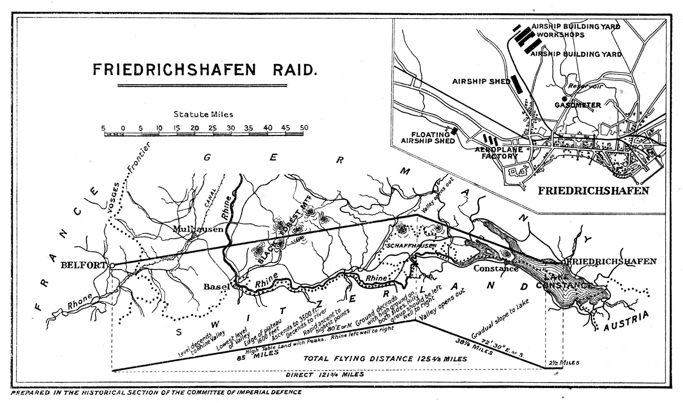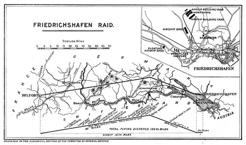 The air raid on Friedrichshafen, November 21, 1914. Secret preparations. The course from Belfort to Lake Constance. Lieutenant Sippe's log. Effect of the bombs. Squadron Commander Briggs taken prisoner. German alarm and later costly defences. The praise of the Avro. The question of Swiss neutrality.