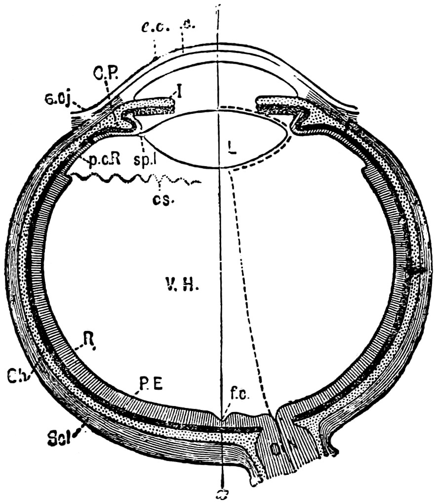 Scl is the sclerotic coat. Ch the choroid coat, with CP the ciliary process. I is the body of the Iris. R is the retina or inner wall. PE the pigment epithelium or outer wall. L the lens held by the suspensory ligament sp.l. VH is the vitreous humour. ON the optic nerve, ox is the optic axis, in this case made to pass through the fovea centralis, f.c.