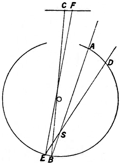 The retina consists essentially of an inner and outer wall, enclosing matter which is similar to the grey matter of the brain. On the inner wall are the vessels which are connected with the optic nerve. The outer wall is epithelium coloured with a pigment, and it is here that the visual impulses begin, although the rays of light giving rise to them have to pass through the thickness of the retina7 before so doing. It has already been stated that the light has to pass through the thickness of the yellow spot before a visual sensation is felt in the centre of the field, and the experiments just given offer a fair proof of the truth of the assertion, but there is still another which is perhaps more conclusive. Suppose we have a hollow reflecting ball, as shown in Fig. 2, and through an orifice A we project a beam of light to B, which meets an obstruction, S, in its path, then A B would be reflected from B to C on a screen C F, and the obstruction S would be marked at C. If another beam from D was directed so as to meet the same obstruction, its presence would be marked at F. Knowing the distance of the centre O of the hollow sphere from F C and its diameter, and measuring the distance between F and C and their respective distances from the axis of the sphere, the distances S B and S E can be calculated. This method is applied in the formation of what are known as Purkinje’s figures. The simplest case is where a beam of light is directed through the sclerotic and transmitted through the lens. Images of the retinal8 vessels are distinguished as at S, and it is found that they cast shadows, which are seen as dark lines in the glare of the field of vision. The sensation of light must therefore come from behind these vessels, and calculation shows that the seat of the sensation is close to the pigmented inner wall of the retina.