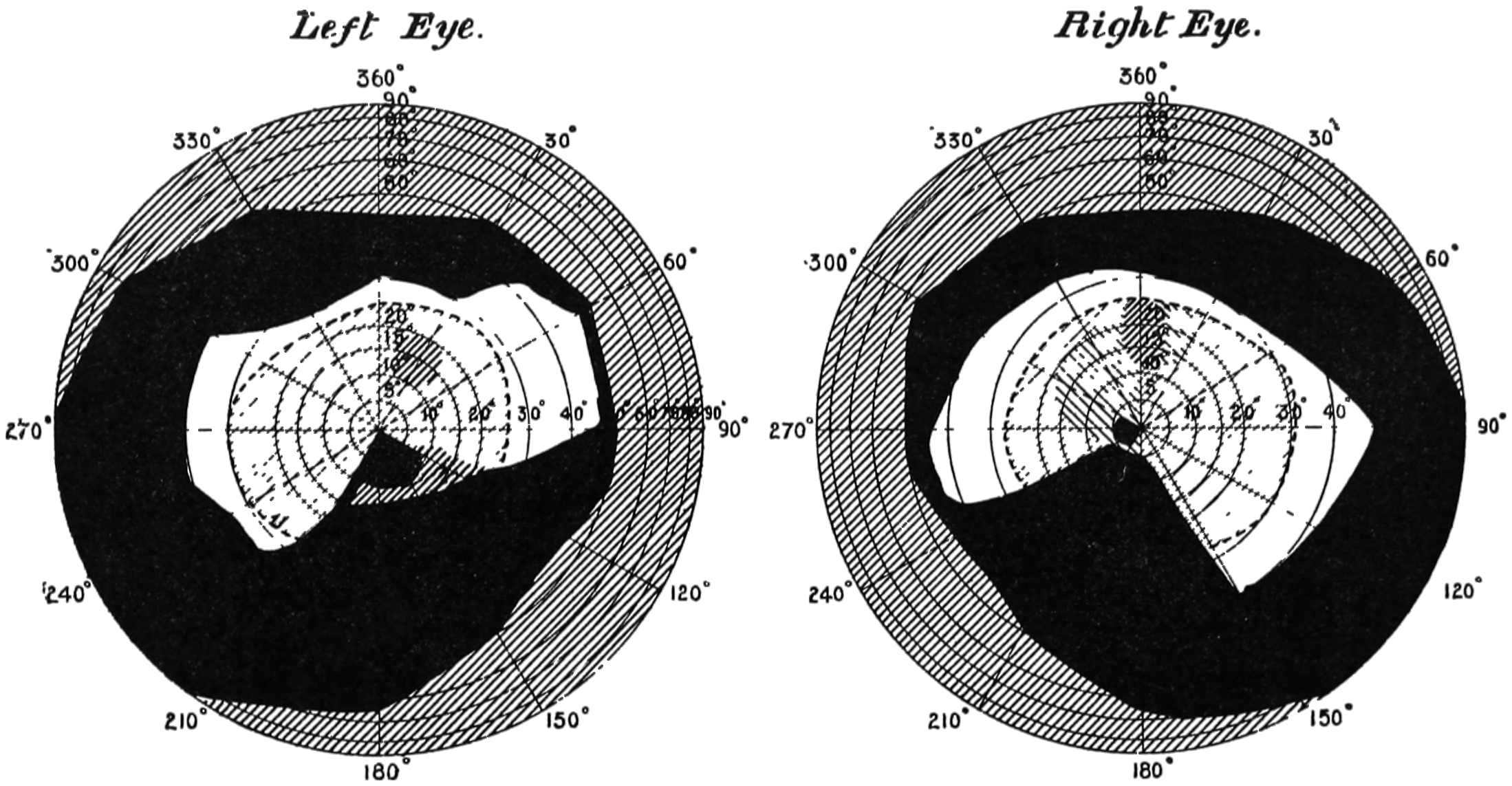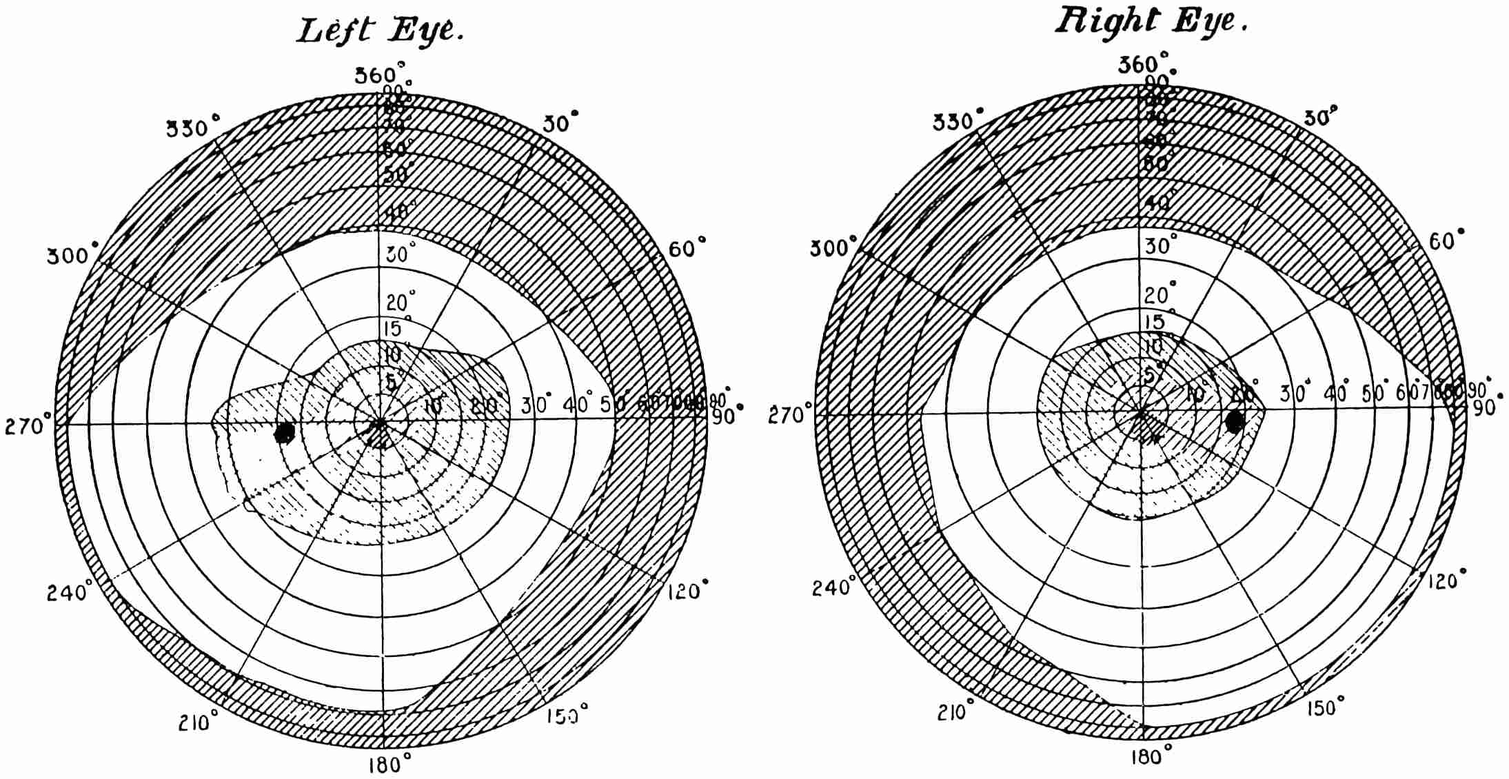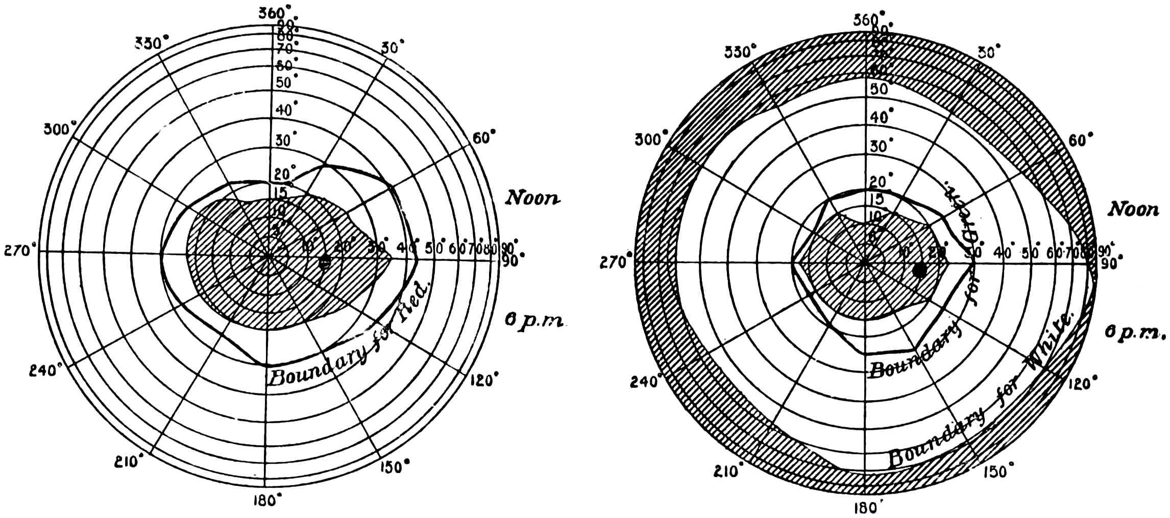 The diagrams (Fig. 3) will show the fields in a satisfactory manner. The concentric circles are supposed to be circles lying on the retina corresponding to parallels of latitude on a globe, and are not, therefore, equi-distant when seen in projection. To make these circles it must be imagined that we have a bowl, in the middle of which is a thin rod standing upright12 and passing through the centre, and another rod attached to it at the centre of the sphere of exactly the length of the radius. If this last arm be opened to make an angle of 5° with the fixed rod, and be twisted round like the leg of a compass against the bowl, it will make a circle, the projection of which will give the innermost circle of the diagram; if opened to 10° it will give the next circle, and so on for every subsequent 10°. The lines passing through the centre are 30° from one another, the line stretching from 360° to 180° being a line supposed to be vertical. By means of an instrument called the perimeter, the field of vision for each eye can be measured. With its aid any small object can be made to fall on any part of the retina by directing the axis of the eye to a fixed point and moving the object along one of the diameters. Suppose we wish to ascertain the field for a white object, a small white disc is moved, say, along the horizontal line, and the angles at which the retina just no longer sees it are noted. This gives two points in the field, and they are plotted on the chart—in Fig. 3 one touches the outside circle, and the other is at an angle of about 65°. The field of vision is next tested along another line, say 300° to 120°, and other points noted and marked on the chart. When13 the whole circle has been examined, the various points are joined together, and we have the boundary of vision for a white object. The boundaries of the colour perception for (say) small red and green discs are found in the same way. The former is depicted in the left-hand chart and gives the field for the right eye, and the latter with that for white in the right-hand chart for the same eye. It will be noticed that two boundaries are given, one taken at mid-day and the other at 6 p.m. The brighter the colour, the larger is the boundary in both cases, showing that the field of colour vision varies according to the illumination. Now it is difficult from this method of experimenting to determine whether the fields for different colours are the same or differ in extent, as we have no information as to whether the colours themselves which were used were physiologically equal. The only way by which this can be satisfactorily determined is by using spectrum colours each of known brightness and area. (Some preliminary experiments made by myself regarding the colour fields will be found in the appendix, and will be referred to later.) It must not be thought that the various colour boundaries mark the limit at which light is perceived, but only the limit at which colour is seen; outside the boundaries the objects appear of a nondescript colour,14 to which we shall by-and-by call attention. The yellow spot lies within the circle of 5°, and the blind spot on which no sensation of light is stimulated is shown by the black dot about 15° away from the centre.