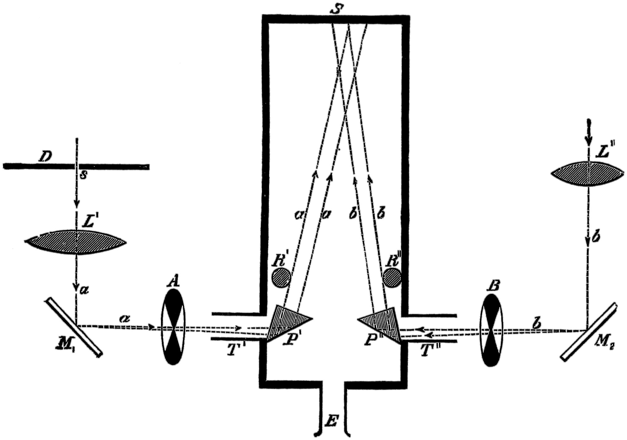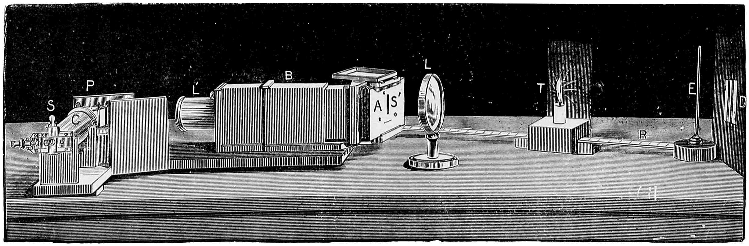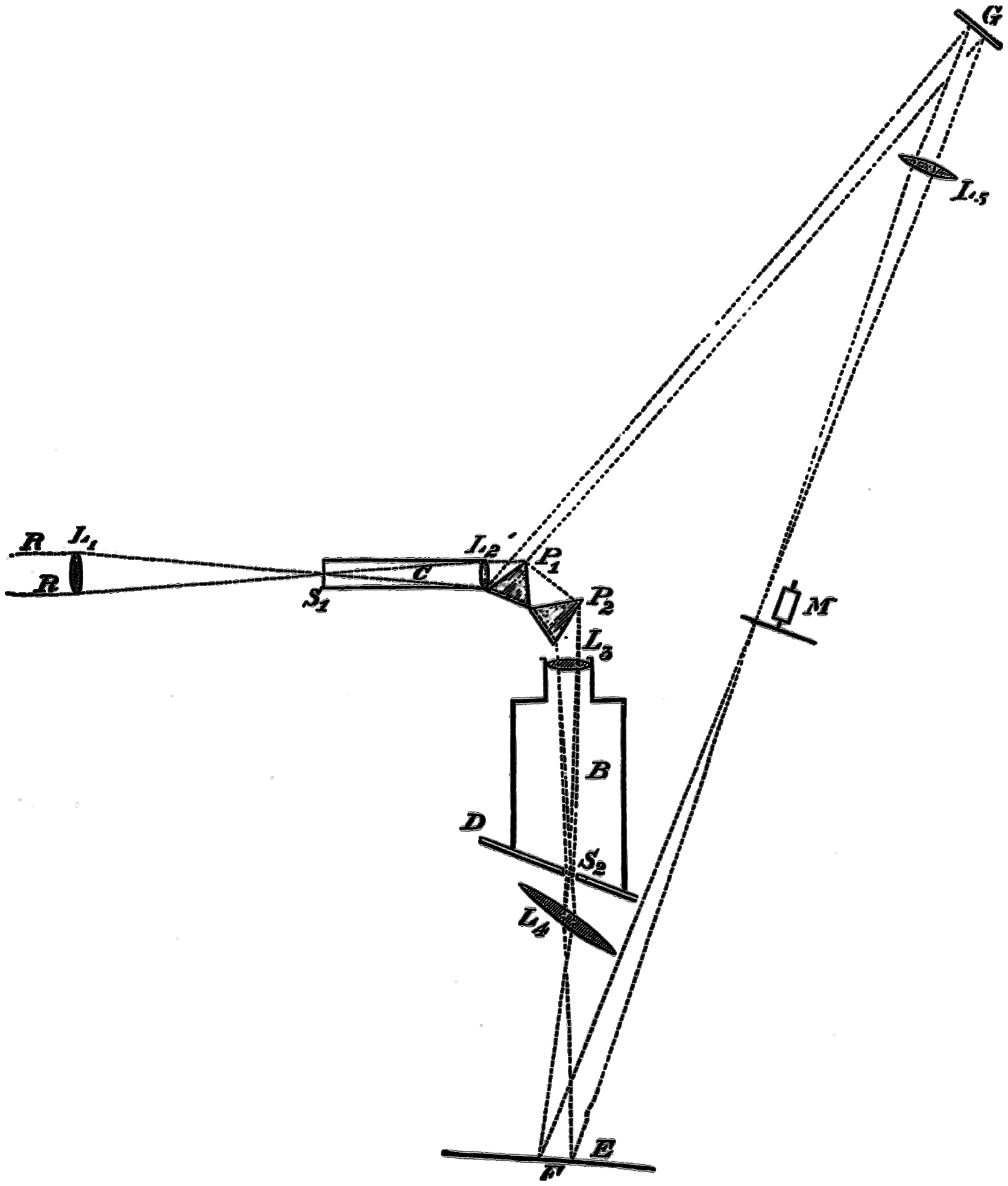 R R are rays coming from the source of light, be it sun light or the electric light, and an image of the one or the other is formed by a lens L₁ on the slit S₁ of the collimator C. The parallel rays produced by the lens L₂ are partially refracted and partially reflected. The former pass through the prisms P₁, P₂, and are focussed to form a spectrum at D by a lens L₃. D is a19 movable screen in which is an aperture S₂, the width of which can be varied as desired. The rays are again collected by a lens L₄, and form a white image of the surface of the last prism on the screen E. If the light passing through S₂ is alone used, the image at E is20 formed of practically monochromatic light. Part of the rays falling on P₁ are, as just said, reflected, but as it and the refracted part are portions of the light passing through the slit S₁, they both must vary proportionally. If then we use the reflected portion as a comparison light to the spectrum colours, the relative intensities of the two, though they may vary intrinsically, will remain the same. The rays reflected from P₁ fall on G, a silver or glass mirror, and, by means of another lens L₅, also can be caused to form a white patch on the screen E, alongside the patch of colour. At M, or anywhere in the path of the beams, an electro-motor driving a sector with apertures which can be opened or closed whilst rotating, is placed, and the illumination of either beam can be altered at will. To obtain a large spectrum on the screen E, all that is necessary is to interpose a lens of fairly short focus in front of L₄, when a spectrum of great purity and brightness can be formed.